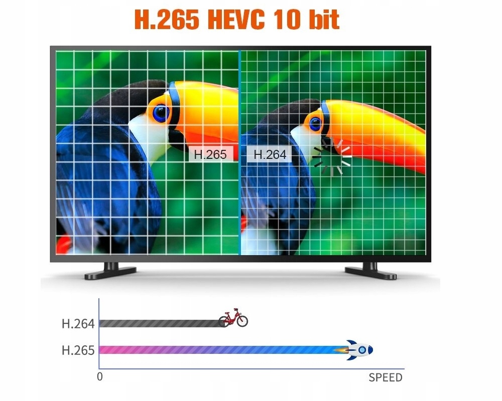 Декодер поддерживает новое сжатие: H.265 HEVC, которое занимает меньше полосы пропускания, чем H.264.