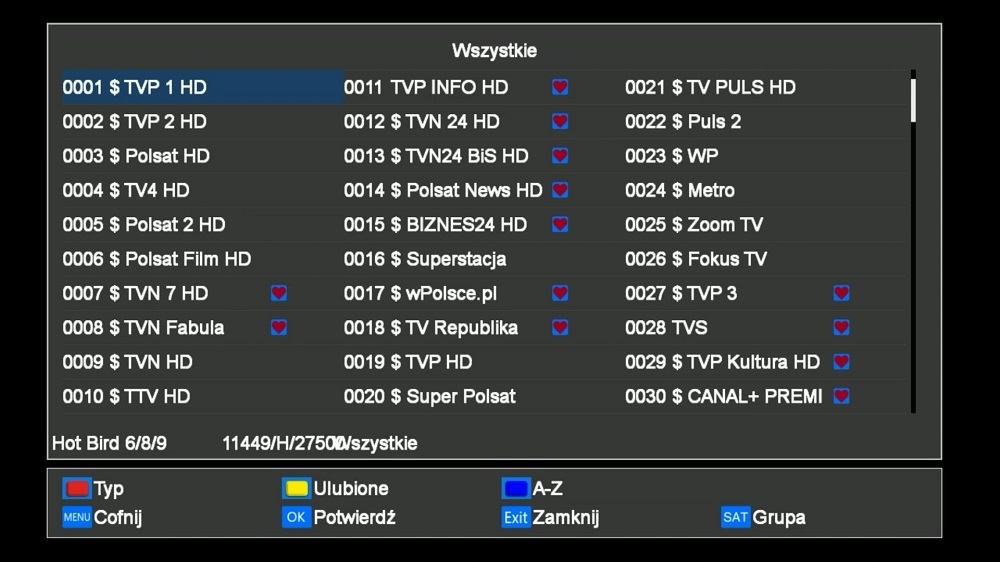 Установленный список PL-каналов, разделенный на группы избранных: Canal+ и Cyfrowy Polsat