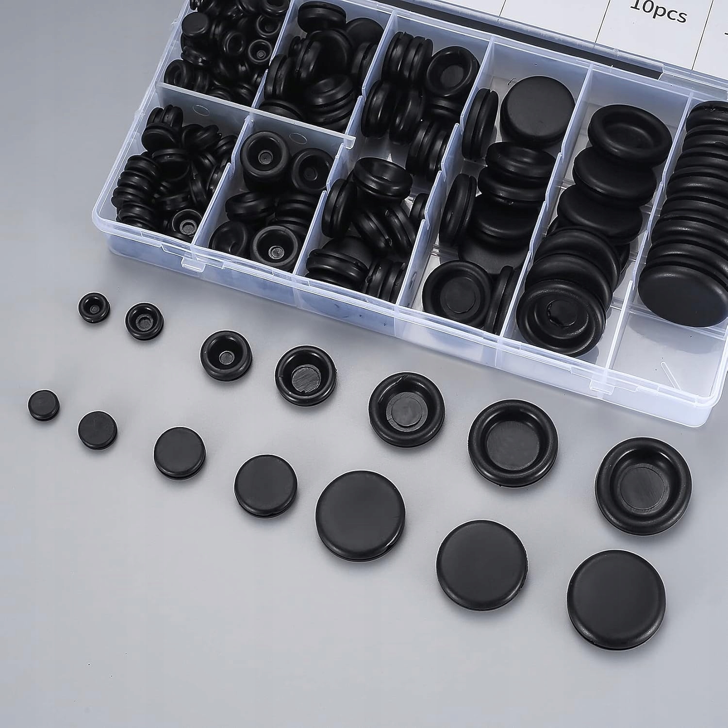 - Всего 200 штук резиновых заглушек, 7 мм х 80 штук, 9 мм х 40 штук, 12 мм х 30 шт., 16 мм х 20 шт., 20 мм х 10 шт., 22 мм х 10 шт., 25 мм х 10 шт.