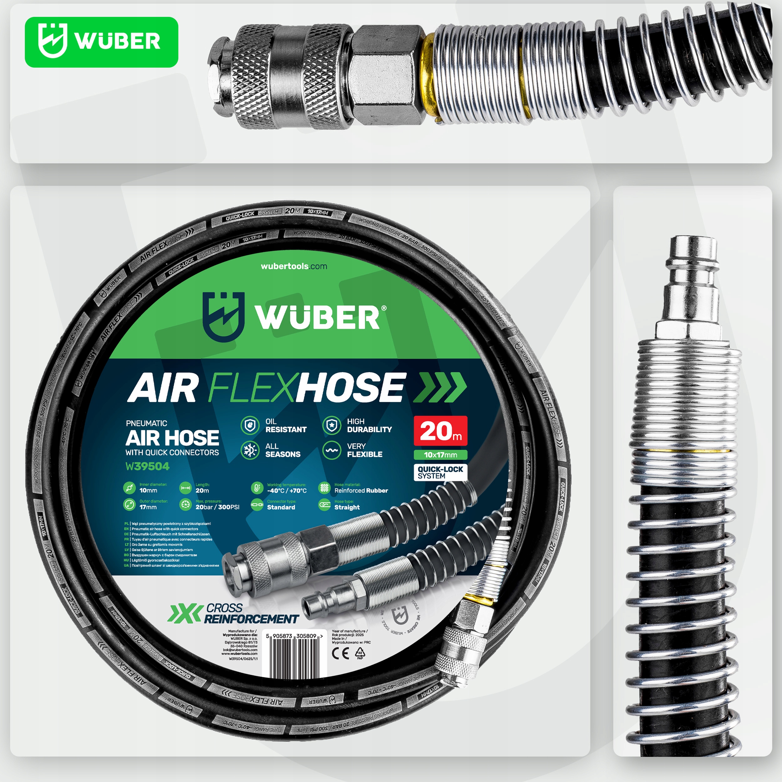 Высокое качество ► Многосезонность ► Маслостойкий ► Гибкий ► Высокая прочность ► Быстроразъемные соединения ► Длина 20 метров ► 20 BAR / 300 PSI ► Температура -40°C +70°C ► Изготовлен из ПВХ ► 10x17 мм