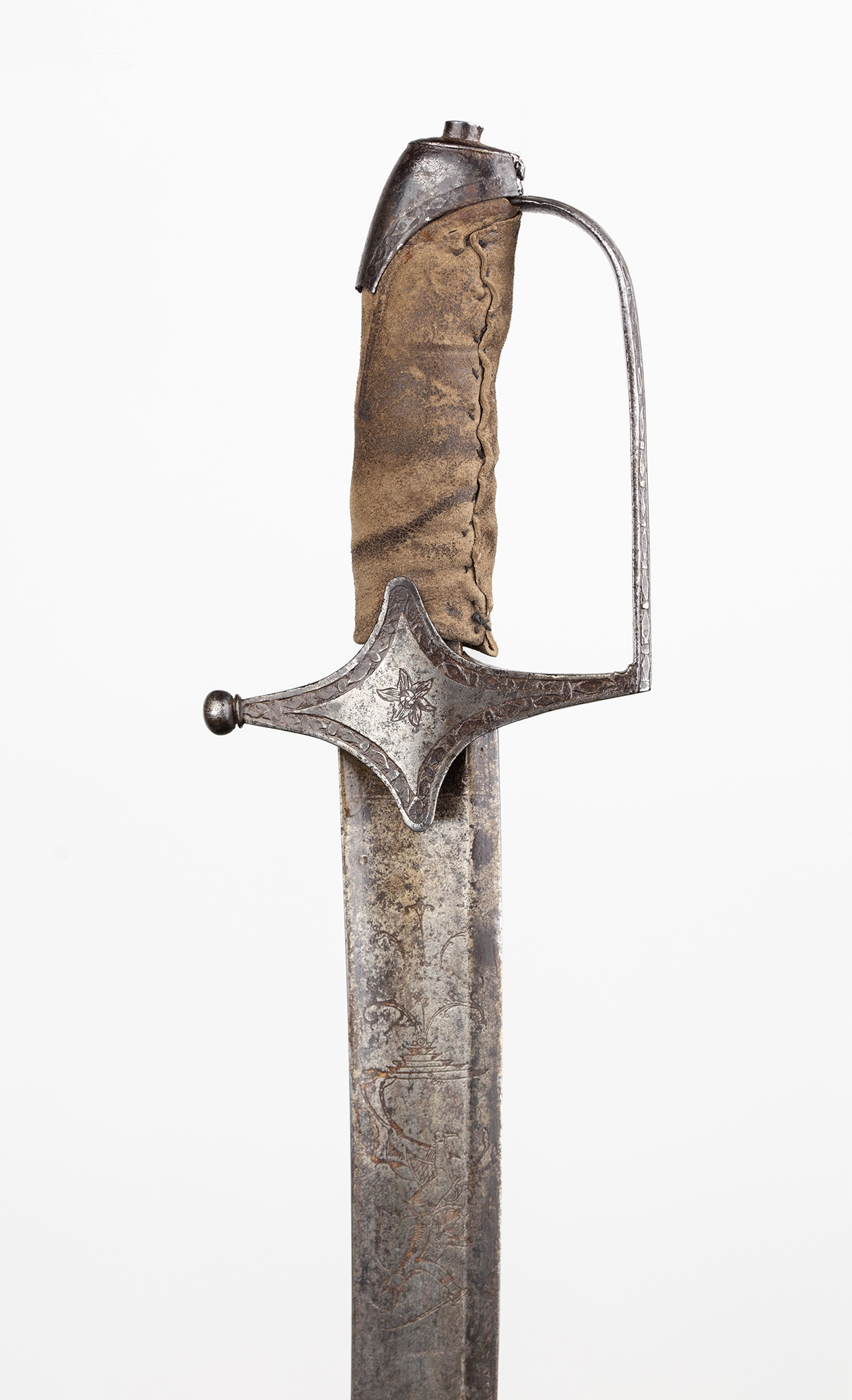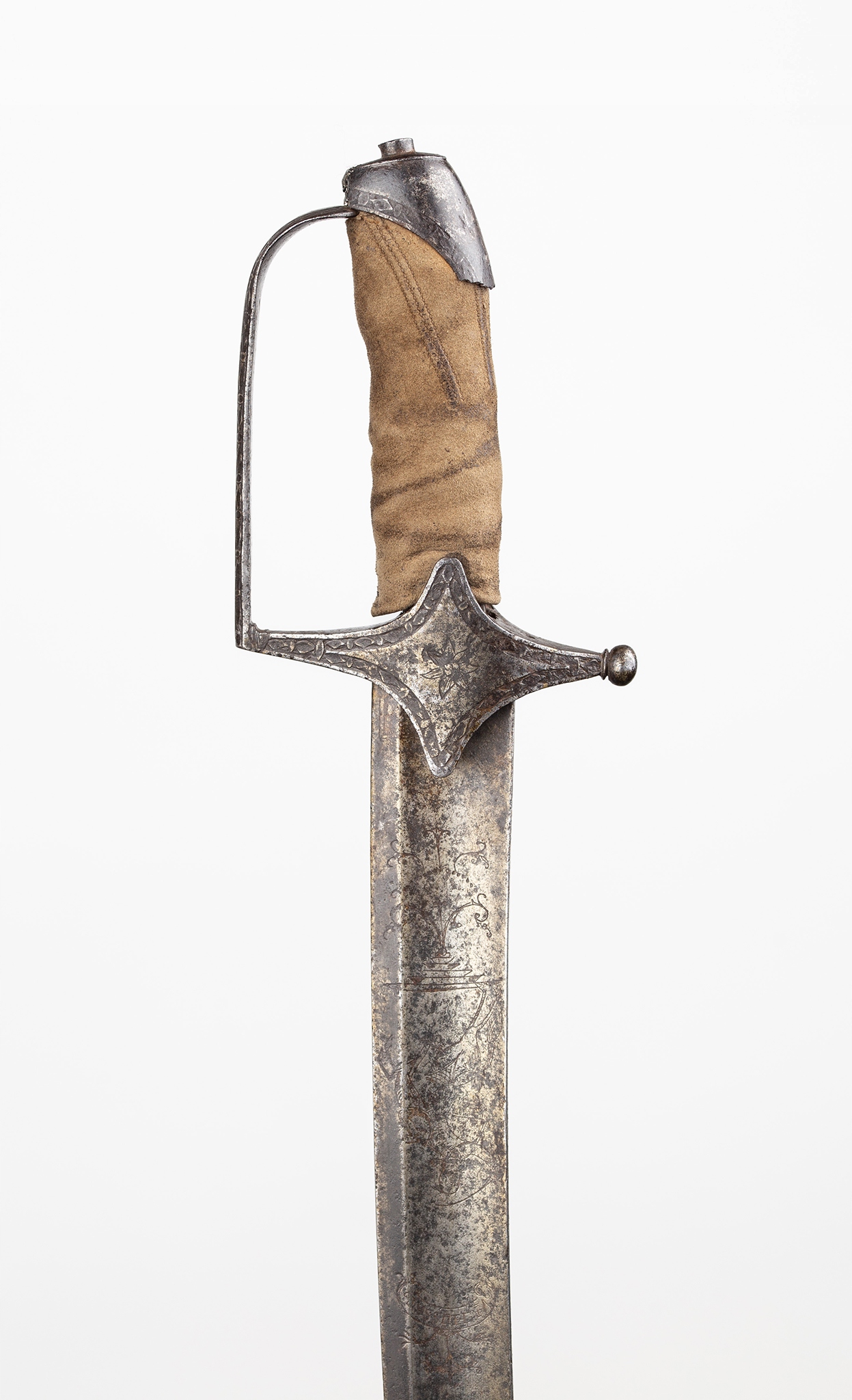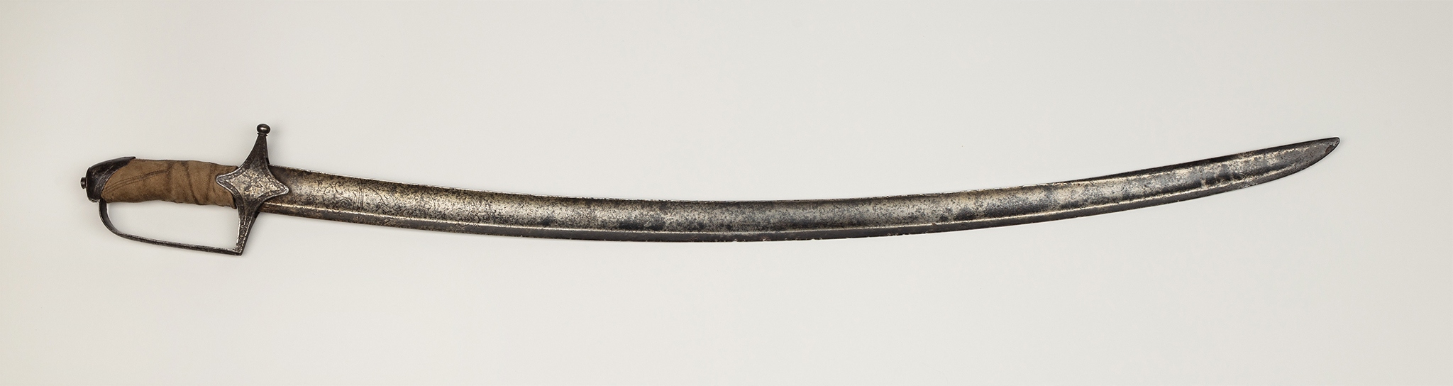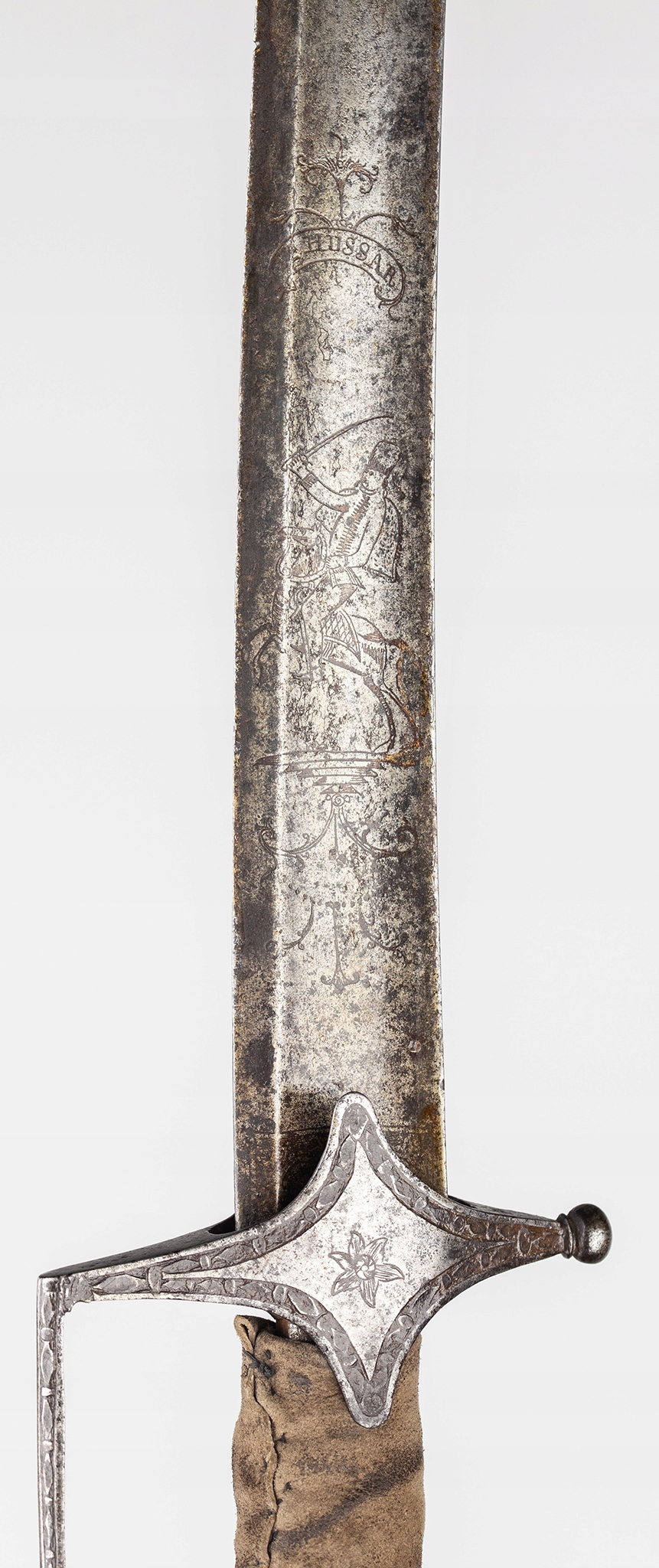 Гусарская сабля первой половины XIX века. Клинок стальной, с гравированным растительным и спиральным орнаментом с обеих сторон и с обеих сторон гусар на коне, над ним лента с надписью: «Виват гусар». Закрытая рукоятка с латунной однорычажной гардой. Лук согнут под прямым углом внизу и изогнут в дугу вверху. Заднее плечо перекладины прямое и заканчивается усами. Ручка обтянута бежевой кожей (без оплетки).