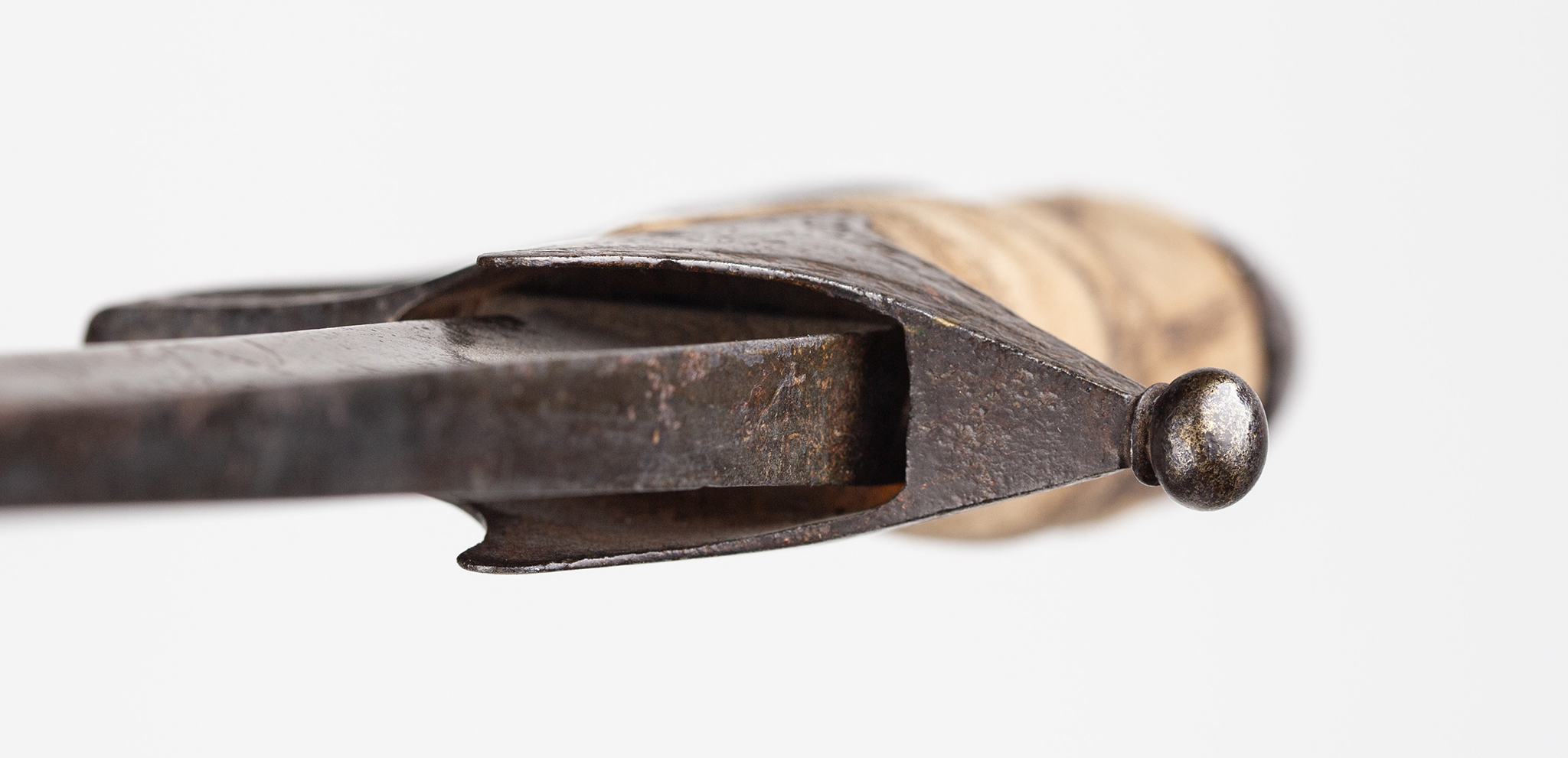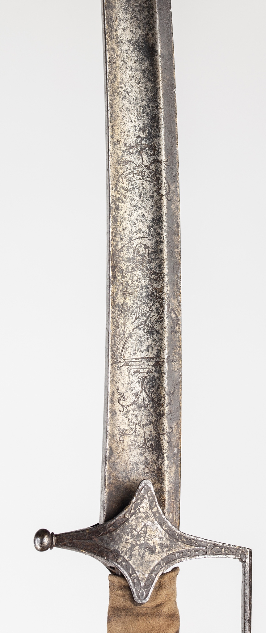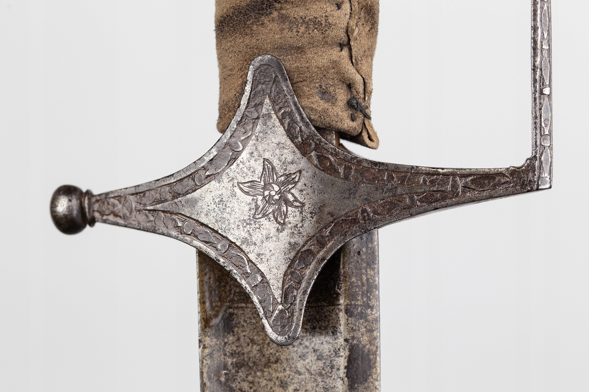 Гусарская сабля первой половины XIX века. Клинок стальной, с гравированным растительным и спиральным орнаментом с обеих сторон и с обеих сторон гусар на коне, над ним лента с надписью: «Виват гусар». Закрытая рукоятка с латунной однорычажной гардой. Лук согнут под прямым углом внизу и изогнут в дугу вверху. Заднее плечо перекладины прямое и заканчивается усами. Ручка обтянута бежевой кожей (без оплетки).