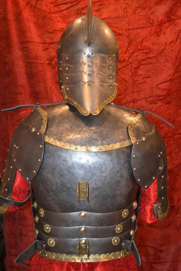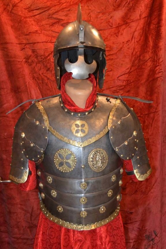 Доспехи украшены латунными полосками, украшенными чеканкой.Нагрудник с Медальоном Девы Марии и крестом.
