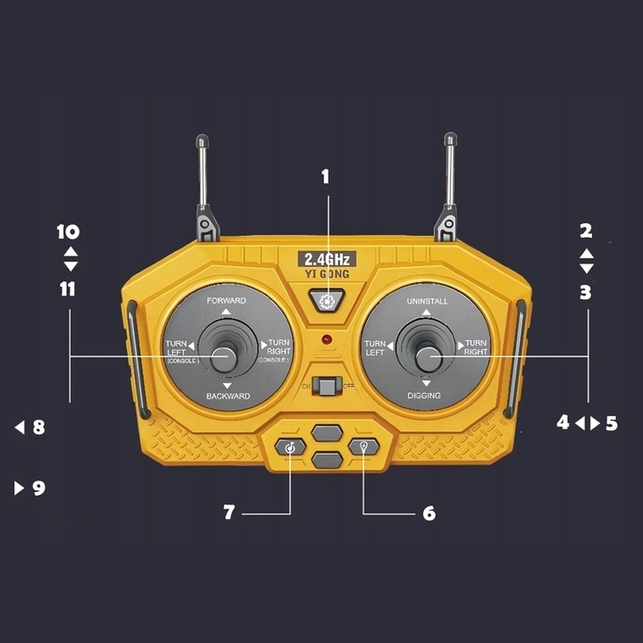 - В комплект входят: управления, пульт дистанционного управления позволяет полностью контролировать все функции экскаватора, включая движение вперед, назад, повороты и повороты.