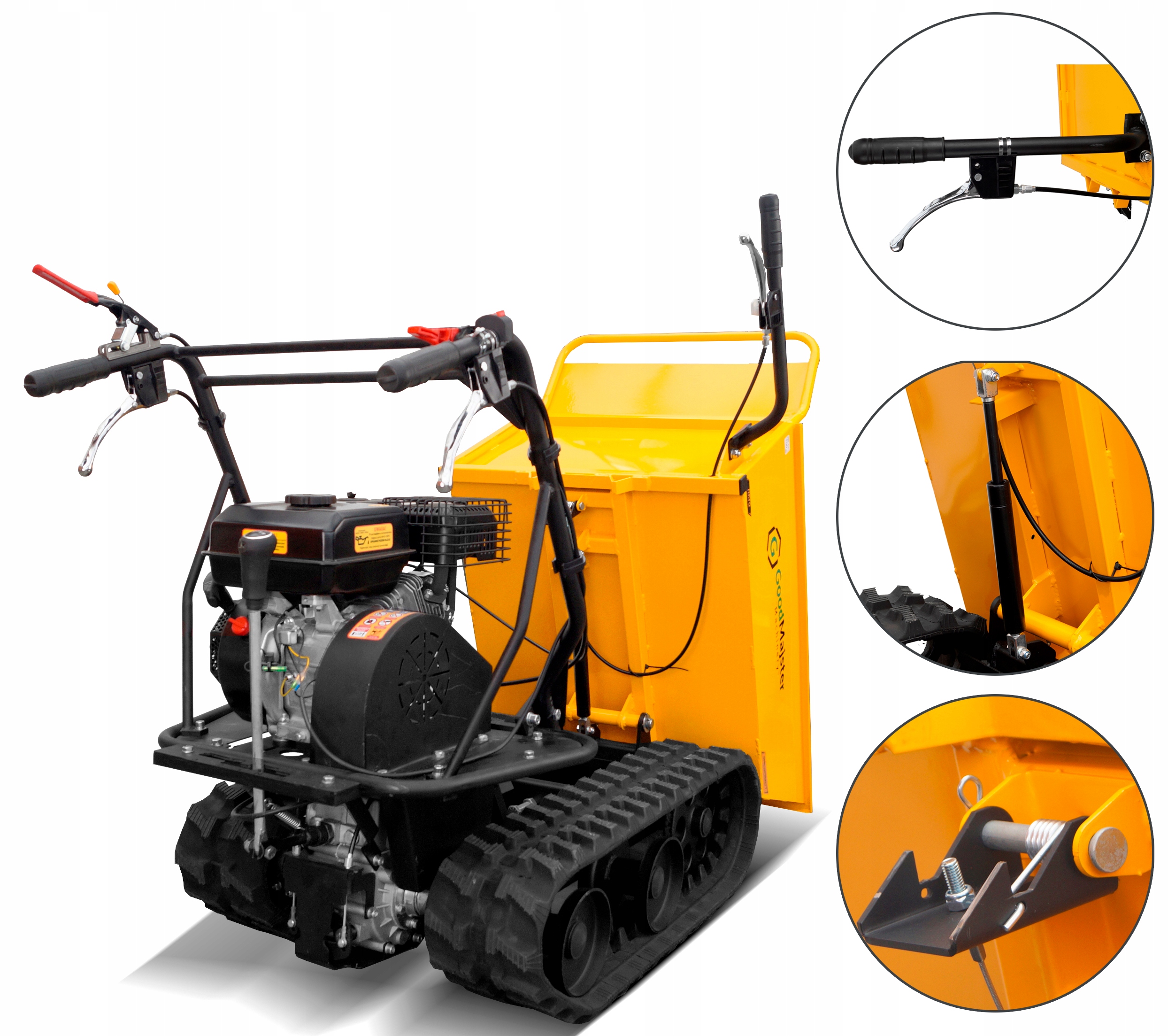 Гусеничный самосвал GoodMajster Machinery GMM-DP300TT — это транспортер, также известный как мини-самосвал внутреннего сгорания с двигателем RATO, с максимальной грузоподъемностью 300 кг. Он оснащен мощным двигателем объемом до ⏩ 212 куб.см, надежным гусеничным ходом и ⏩ 4-ступенчатой коробкой передач с ⭐ 3 передними и ⭐ 1 задними передачами.