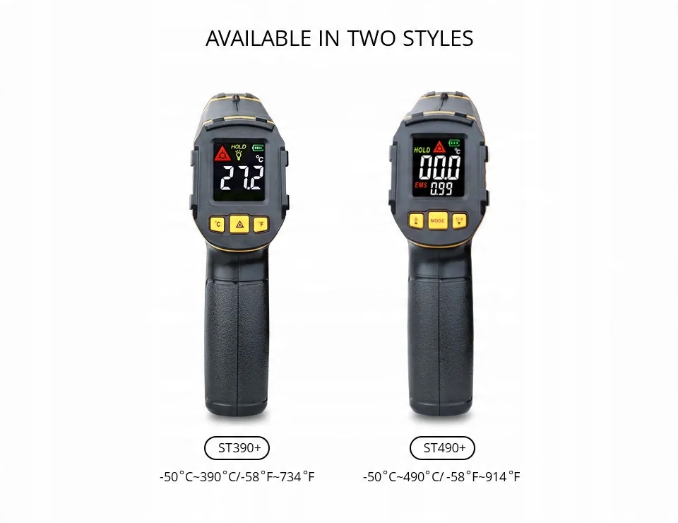 GVDA ST390+ и ST490+ -это продвинутые цифровые не -контактные инфракрасные термометры, предназначенные для промышленных и профессиональных применений. Эти устройства обеспечивают безопасные и быстрые измерения температуры поверхности за несколько секунд, благодаря тому, что они идеально подходят для использования в нефти, химической, текстильной, электрической и железнодорожной промышленности