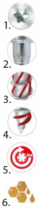 Особая форма фрезерного наконечника означает на 20% меньше сопротивления при завинчивании, что продлевает срок службы аккумуляторов и самих инструментов. Режущие насечки на резьбе разрезают волокна структуры древесины при ввинчивании.