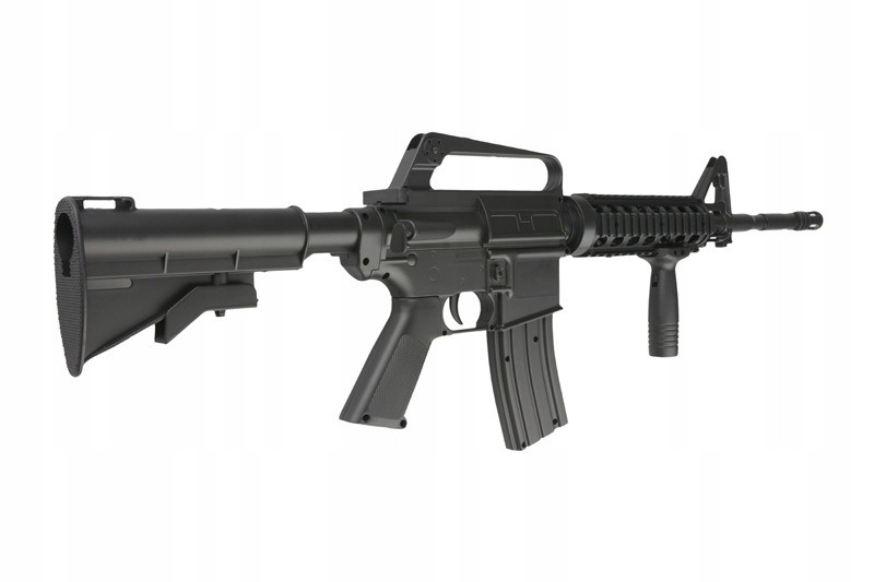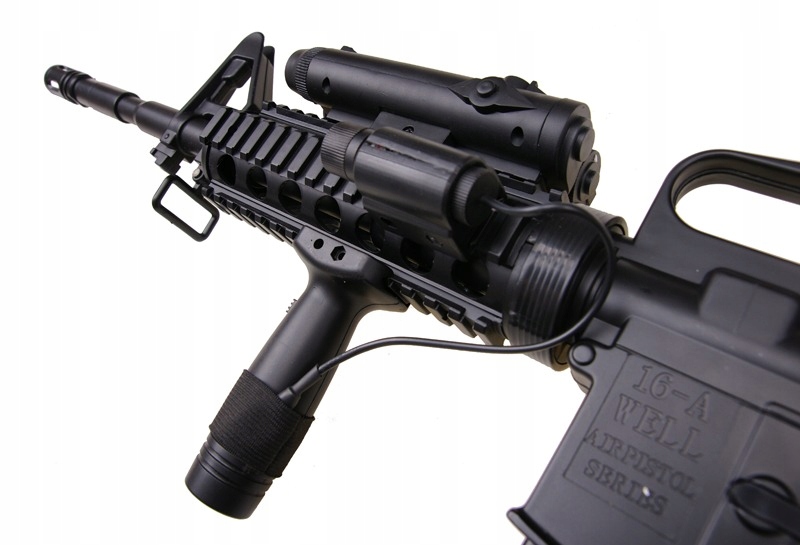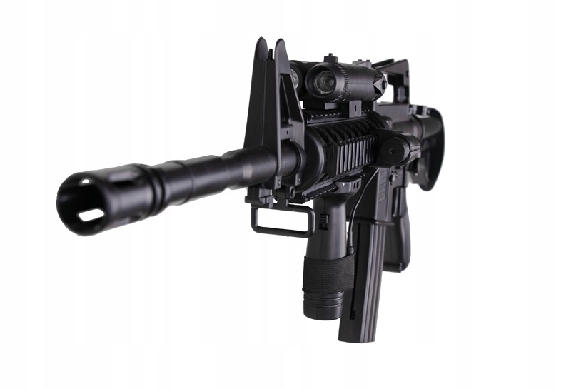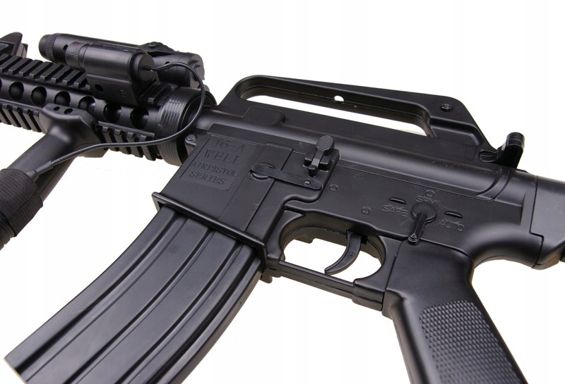 Точная копия штурмовой винтовки А4 изготовлена из прочного АБС-пластика. Он отличается хорошим качеством изготовления и вниманием к таким деталям, как регулируемый прицел в ручке для транспортировки. В стандартной комплектации реплика оснащена направляющими RIS вместо передней рукоятки, типичной для M4. Благодаря этому мы получаем возможность установки дополнительных аксессуаров - тактической рукоятки, реплики лазерного указателя и реплики указателя/осветителя цели AN-PEQ.