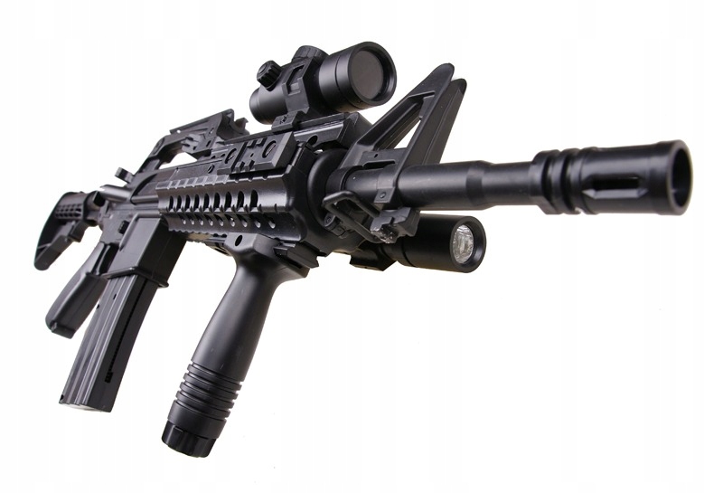 Реплика автомата МР-733 изготовлена из прочного пластика. Он отличается хорошим качеством и вниманием к деталям, таким как регулируемый прицел в ручке для транспортировки или направляющие RIS. В стандартной комплектации реплика оснащена конверсией CASV с направляющими RIS, благодаря чему мы получаем возможность установки дополнительных аксессуаров — передней рукоятки и тактического фонаря. Кроме того, благодаря тому, что RIS-рейка перекрывает транспортировочную рукоятку, мы можем установить коллиматорный прицел в дополнительном месте.