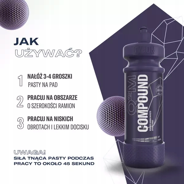 Gyeon Q2M Compound – современная высокорежущая полировальная паста, обеспечивающая высокую эффективность и уровень удаления царапин в сочетании с очень низким уровнем пылеобразования и несравненным качеством отделки. Создан на водной основе.