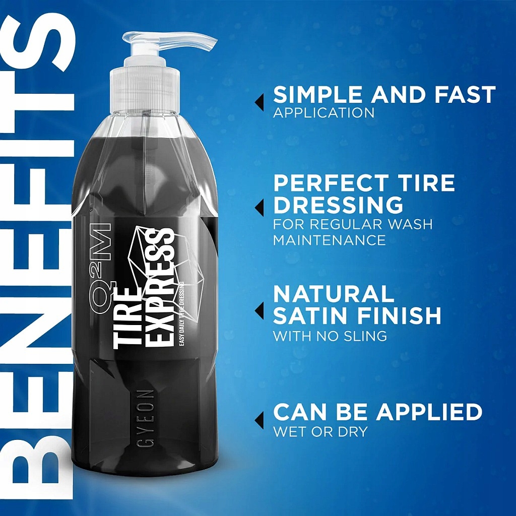 Q²M Tire Express обеспечивает естественный полуматовый визуальный эффект. Он образует самоочищающийся гидрофобный слой, который сохраняет чистоту шины и не исчезает даже после длительной езды под дождем.