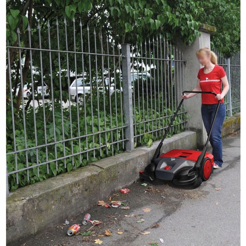 - Подметальная машина удобна и проста в использовании, среди прочего: благодаря большому, легко опорожняемому баку для отходов. Выступающие с обеих сторон щетки и боковые направляющие ролики, а также регулируемое давление на щетки обеспечивают тщательное подметание даже в труднодоступных местах.