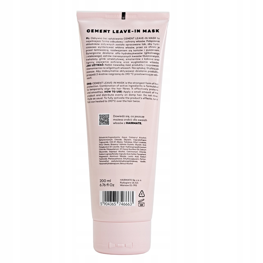 Интенсивно восстанавливающая термомаска для всех типов волос АКТИВНЫЕ ИНГРЕДИЕНТЫ: Альфа-гидроксивазы, трегалоза, смектитовая глина, кокосовое маслоCEMENT LEAVE-IN MASK. сильнейшая форма восстановления и защиты волос. Комбинация активных ингредиентов была разработана для временного выравнивания волокон волос, защищая их от ломкости, секущихся кончиков и вьющихся волос. Синергический эффект альфа-гидроксикислот (гликолевой и молочной), эфиров ненасыщенных жирных кислот, трегалозы, смектитовой глины, кокосовых смягчающих веществ и лигнина обеспечивает защиту и разглаживание волос. СПОСОБ ПРИМЕНЕНИЯ: Нанесите небольшое количество продукта и равномерно распределите. на влажных волосах. Не полоскать. Стиль как всегда. Для полной активации действия средства дважды проведите по волосам выпрямителем, нагретым до 190 °C.