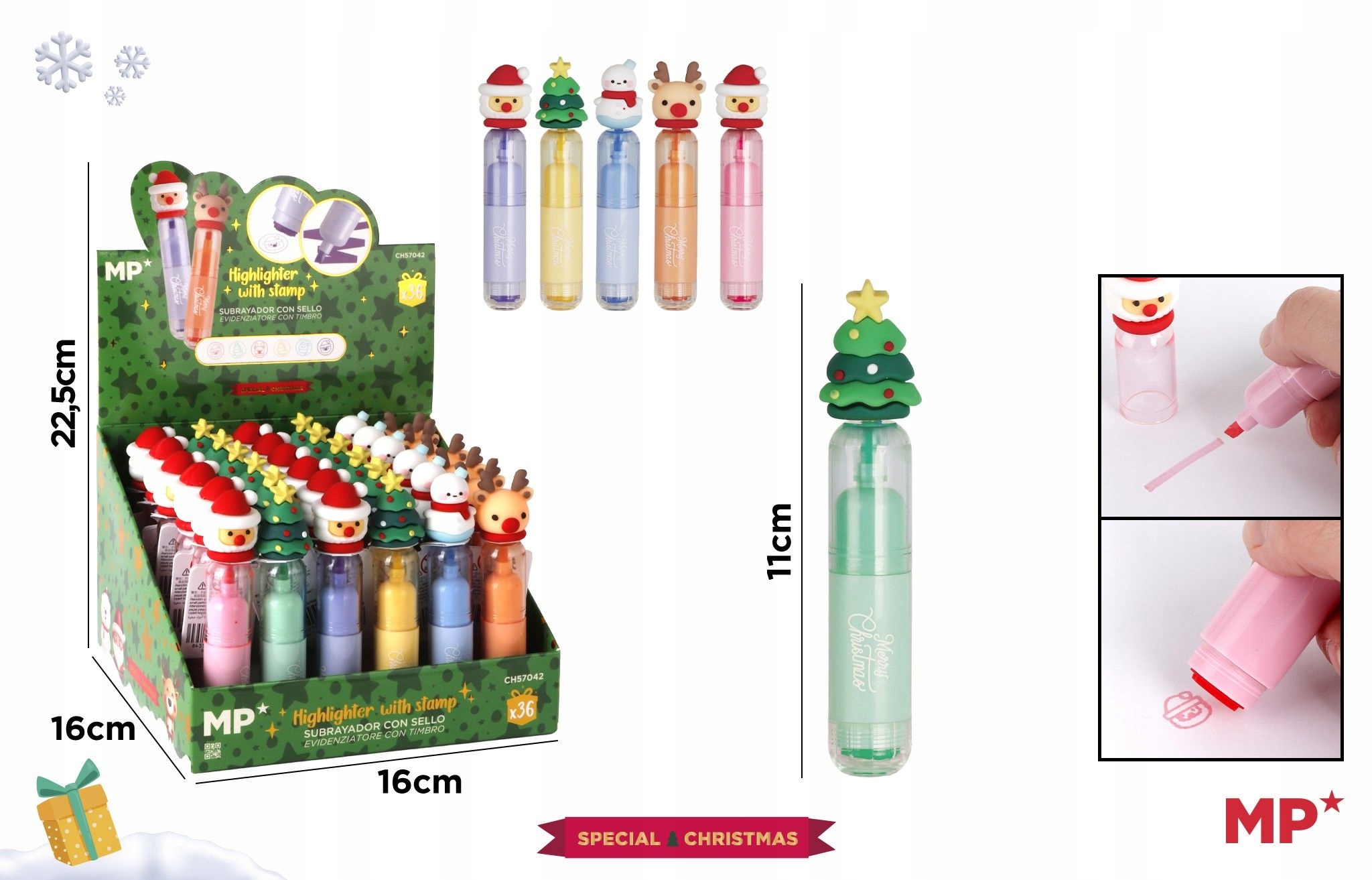 Хайлайтер со штампом. Размеры: 10 × 2 см. Одна сторона - хайлайтер с колпачком с новогодней фигуркой. Корпус ручки имеет однотонный цвет, соответствующий чернилам. На другом конце — марка с рождественским мотивом.