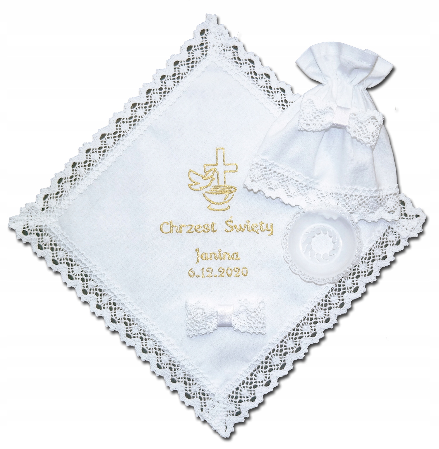 Повязка на голову и каплесборник подходят для традиционных белых крестильных свечей.