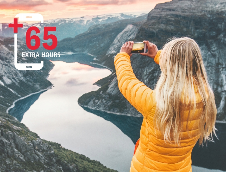 Емкость 10 000 мАч обеспечивает до 65 часов дополнительного питания*