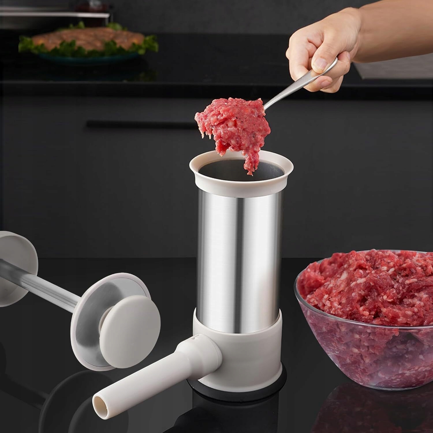 По сравнению с традиционными пластиковыми колбасой, этот вертикальный наводчик легче в использовании. Просто поместите соответствующее мясо в цилиндр на лице, поместите крышку на трубу, затем нажмите толпу, чтобы набрать колбаски. Колбаса будет готова в мгновение ока.