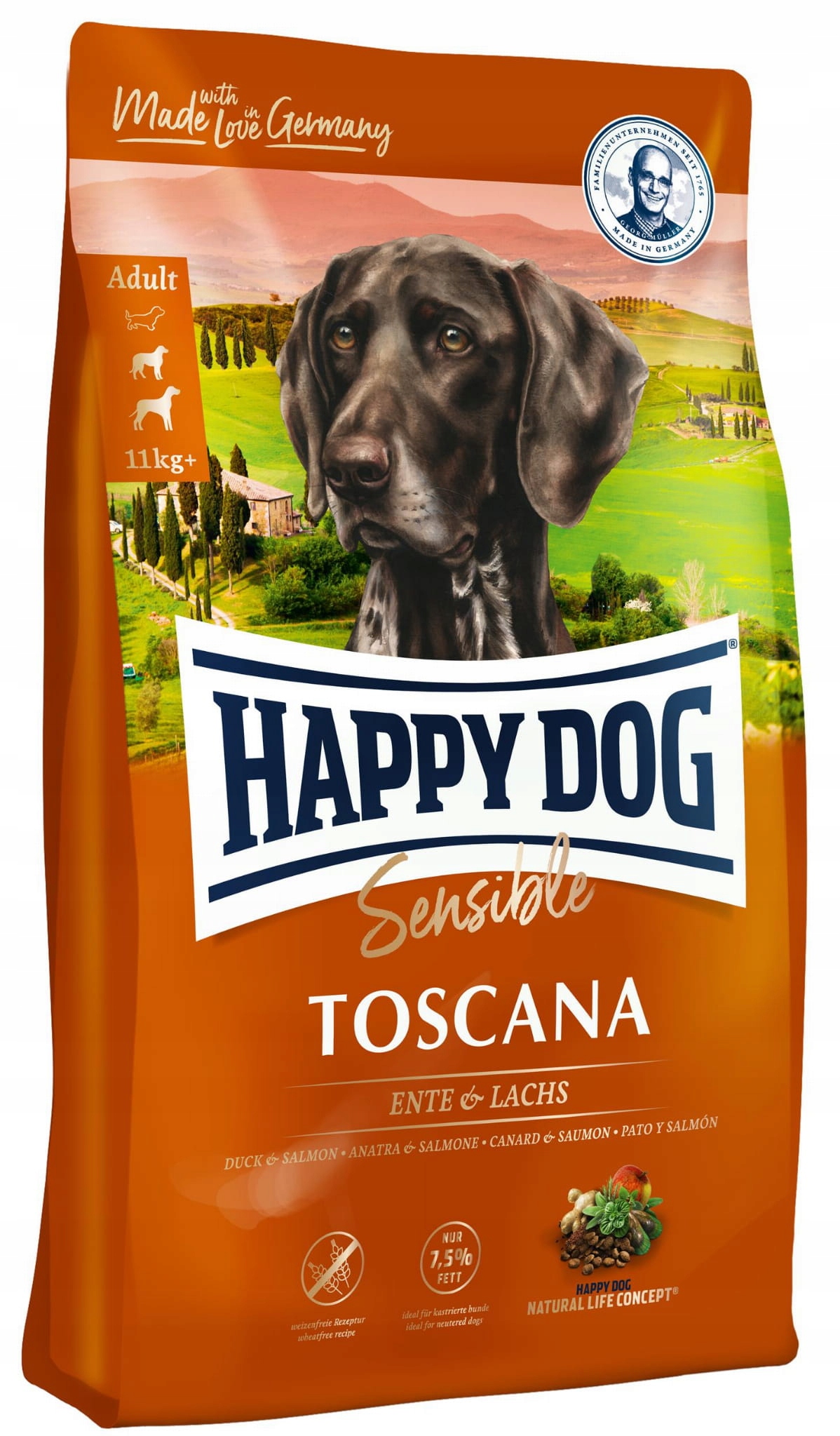 В течение долгого времени ингредиенты классической средиземноморской кухни - это естественная защита от современных заболеваний цивилизации и сердечно -сосудистых проблем. Очень ароматические средиземноморские травы, утиное мясо, лосось и полифеноловые вещества красного винограда должны быть особенно выделены. Только Happy Dog Toscana предлагает это уникальное разнообразие ценных ингредиентов. Уникальная концепция Happy Dog Supreme LifePlus® из натуральных, известных ингредиентов дополняет эксклюзивный рецепт-полноценную и постоянную сухой пищи в качестве супер-восстановителя создается. Благодаря конкретной композиции и специальному методу производства Toscana очень хорошо подходит для сознательного питания, особенно чувствительных собак с особыми потребностями. Благодаря умеренному содержанию жира (7,5%), при 22% белка, пища идеально подходит для всех собак с низкой потребностью в энергии и обычной потребности в белке (также для кастрированных животных). Доля животных белков к общему содержанию белка: 76%