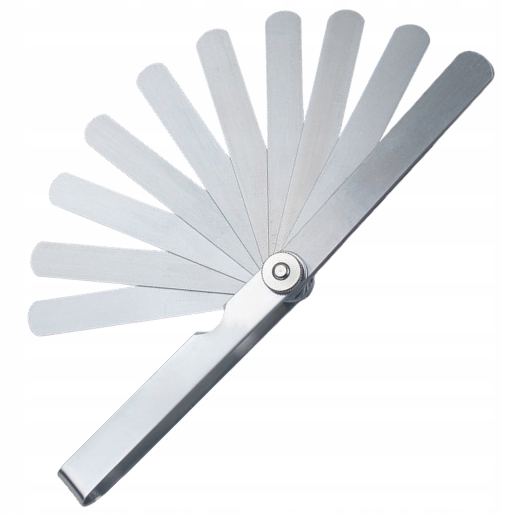 Он оснащен 10 лезвиями разной толщины, что позволяет измерять зазоры различных размеров. Толщина листов составляет от 0,10 мм до 1 мм, что позволяет адаптировать инструмент для широкого спектра применений и точного измерения зазора.
