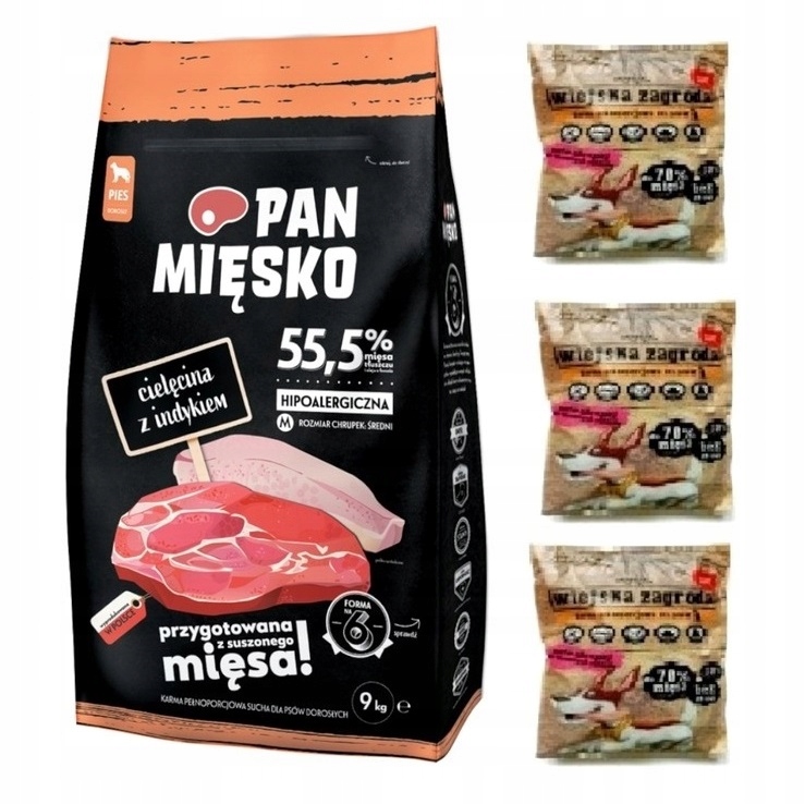 Познакомьтесь с гипоаллергенным сухим кормом для собак Pan Mięsko. Их отличает тщательно отобранное мясо с добавлением сочных польских яблок, полезных овощей и ценных питательных веществ, которые положительно повлияют на здоровье и состояние вашей собаки. Наши рецепты составлены специалистами, чтобы обеспечить вашего четвероногого питомца именно тем, что ему нужно. Ваша собака достойна всего самого лучшего.