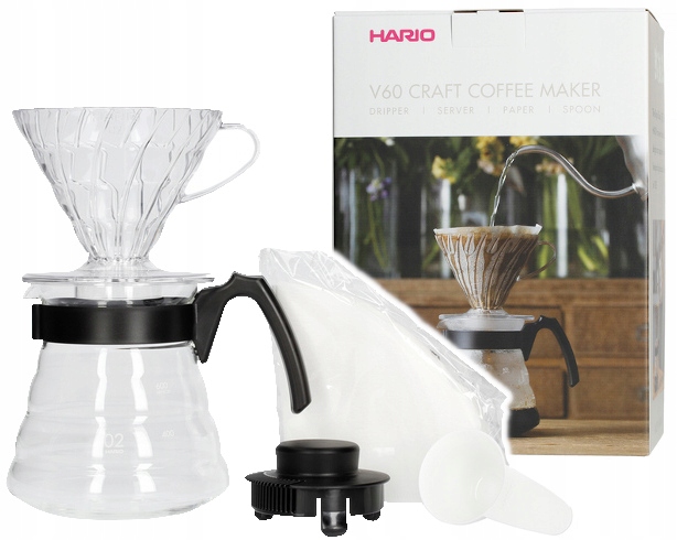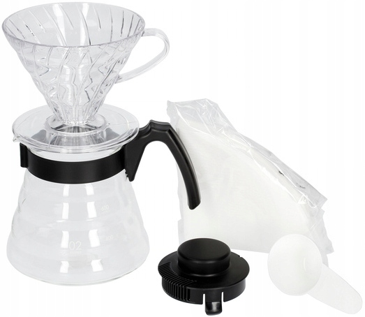 Набор Hario для заваривания кофе методом пуровер , состоящий из: - пластиковой капельницы V60-02 - стеклянного кувшина емкостью 600 мл - 40 бумажных фильтров - мерных стаканчиков для кофейных зерен. Этот набор станет идеальным подарком для человека, интересующегося кофе, а также для всех, кто хочет начать свое приключение с альтернативными методами заваривания.