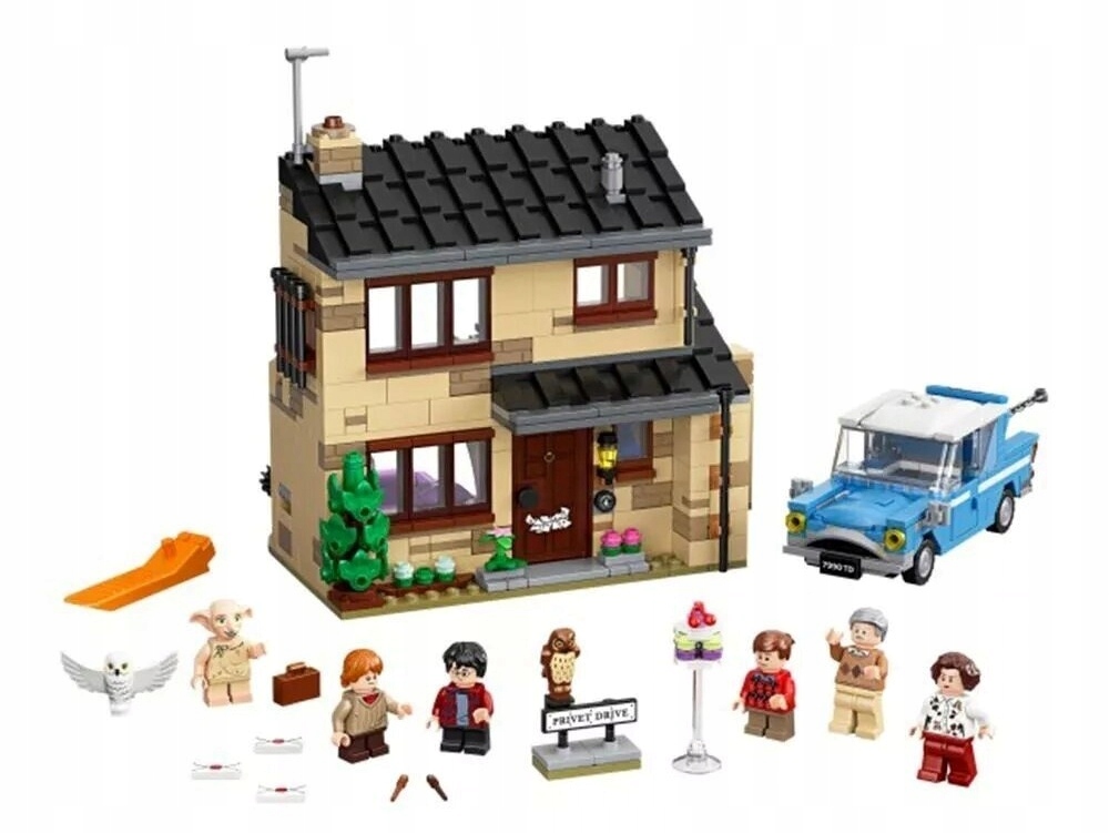 Кроме того, вы найдете сову Хедвиг, летающую машину с открывающейся крышей, дверями и люком, а также другие интересные аксессуары, такие как: палочки, торт , буквы и дорожный знак Тисовой улицы.