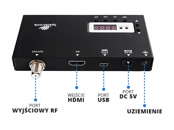 Устройство оснащено входом HDMI, через который мы можем подключить источник сигнала и выходной порт RF для дальнейшей отправки того же сигнала. Устройство требует питания (блок питания входит в комплект), поэтому вход постоянного тока 5В также включен в состав устройства. Кроме того, модулятор имеет USB-порт, позволяющий подключить компьютер для обновления и заземления.