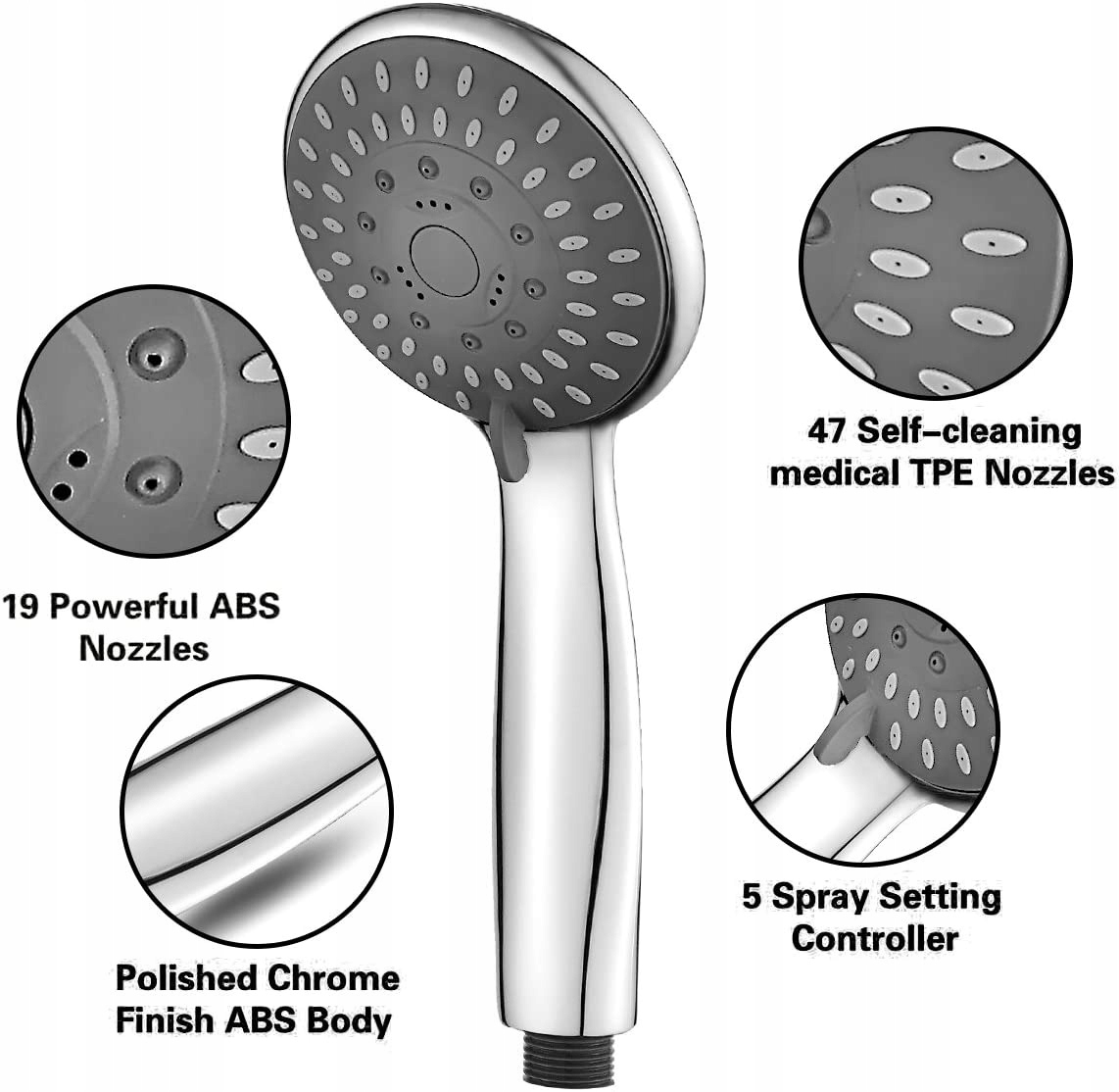 - 5 режимов струи: ручной душ с 5 типами струи - массажная струя/дождевая струя/обычная струя/ обычный и струйный/распыляющий. Высокое качество: изготовлен из прочного АБС-пластика.