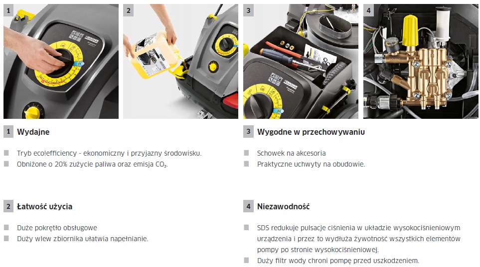Надежная и мобильная – Устройства компактного класса прекрасно подходят для автомастерских, фермерских хозяйств, ремесленных мастерских и малых предприятий. с собственным автопарком. Установленный на входе фильтр тонкой очистки воды защищает насос от загрязнения. Система гашения вибрации SDS снижает пульсации давления в системе высокого давления. Контроль температуры выхлопных газов отключает двигатель после превышения 300°C, обеспечивая безопасность использования. В стандартную версию входит пистолет высокого давления EASY!Force Advanced. Технология EASY!Force снижает усилие, необходимое для удержания спускового крючка пистолета, до нуля. Дополнительно устройство имеет систему крепления оборудования EASY!Lock, которая позволяет менять оборудование в 5 раз быстрее, чем традиционная резьбовая система. Большая ручка управления предназначена для включения и выключения устройства, выбора холодной и горячей воды и регулировки температуры воды. С помощью ручки можно установить режим eco!efficiency. Затем вода нагревается до 60°C, а расход топлива снижается до 20%.