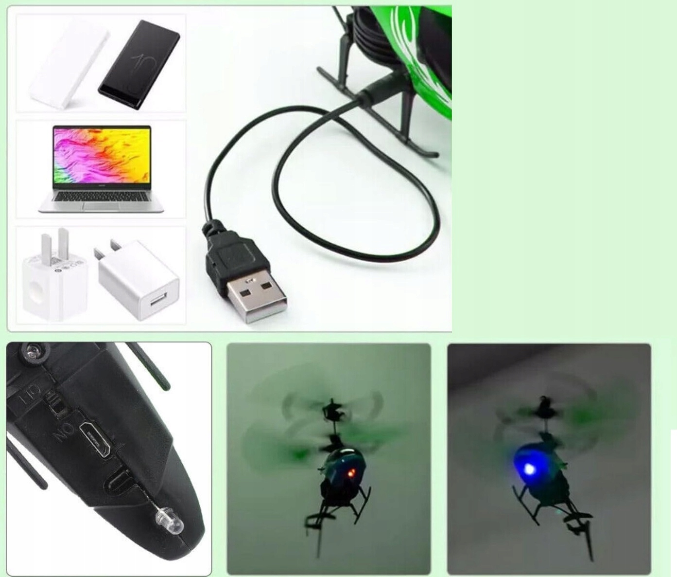 летающий аппарат можно заряжать с помощью входящего в комплект USB-кабеля питания, подключив его, например, к компьютер или ноутбук