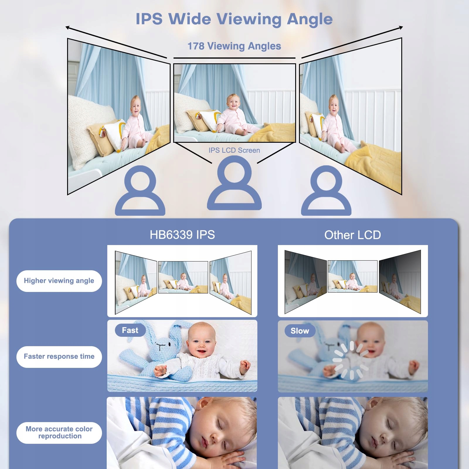 - [IPS-экран и пульт дистанционного управления с возможностью поворота и наклона на 355°] Радионяня HelloBaby с камерой оснащена 3,2-дюймовым IPS-экраном. Он не только предлагает широкие углы обзора, но также имеет яркие цвета и четкость. Дистанционное управление камерой позволяет поворачивать камеру на 355° по горизонтали и на 120° по вертикали, открывая более широкий обзор комнаты вашего ребенка.