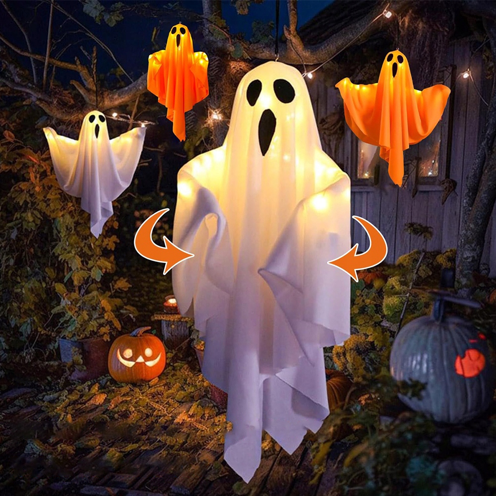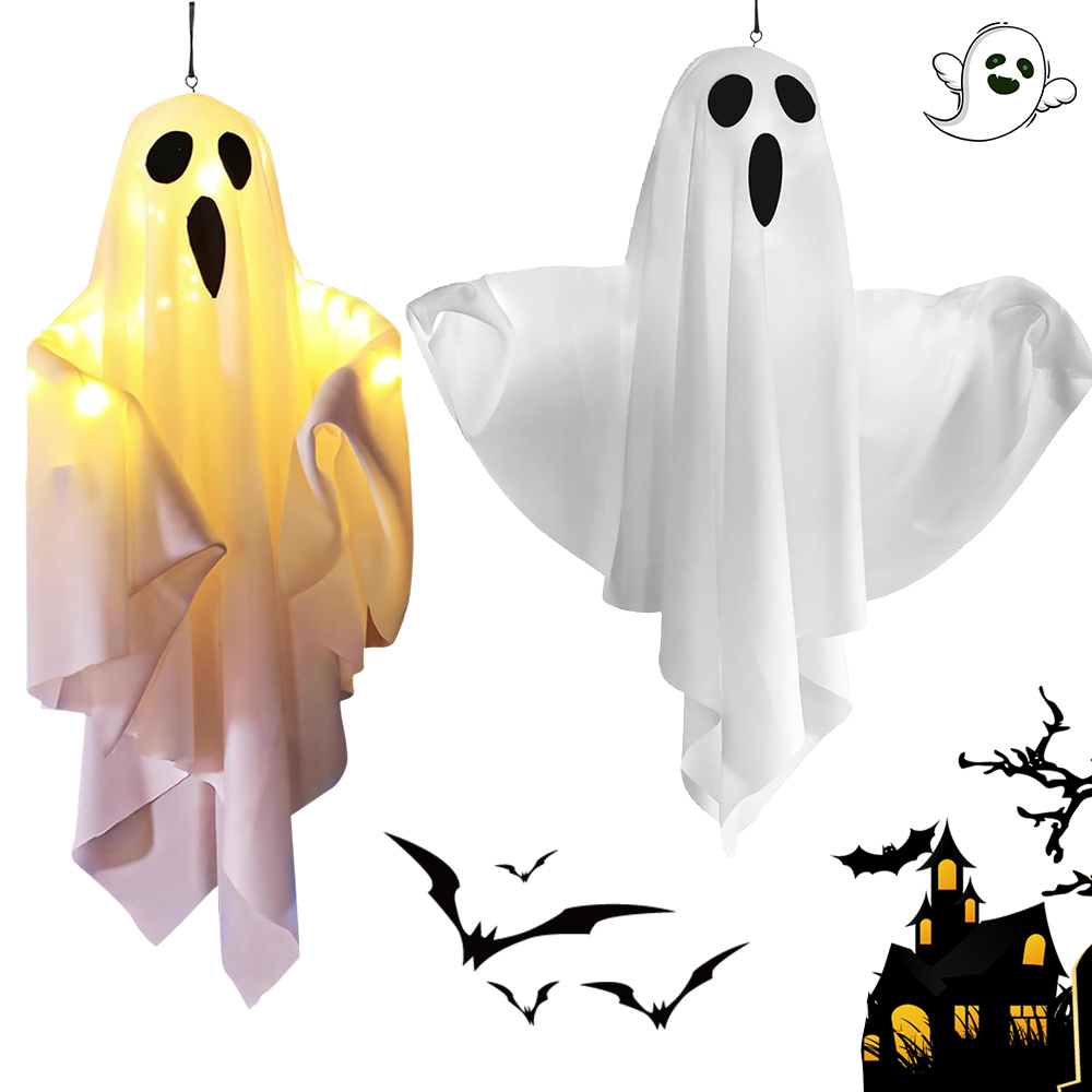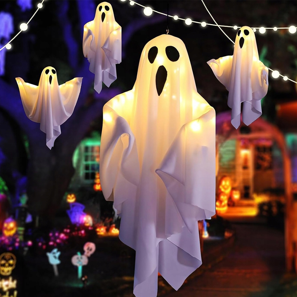 Украшения с призраками для Хэллоуина изготовлены из гладкой полиэфирной ткани и оснащены водонепроницаемыми лампами рождественских деревьев. Они не только очаровательно спроектированы, но и экологически чистые благодаря энергетическим светодиодам, которые экономит энергию. Они идеально подходят для украшений на Хэллоуин в саду или на открытом воздухе, и их также можно использовать в комнатах.