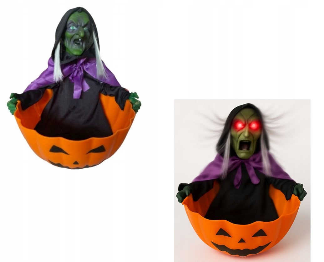 - Поставьте миску на видное место, насыпьте сладости и... ждите реакции гостей. Когда датчик обнаруживает движение, ведьма «оживает», загорается глазами и издает мрачные звуки. Гарантированный эффект!