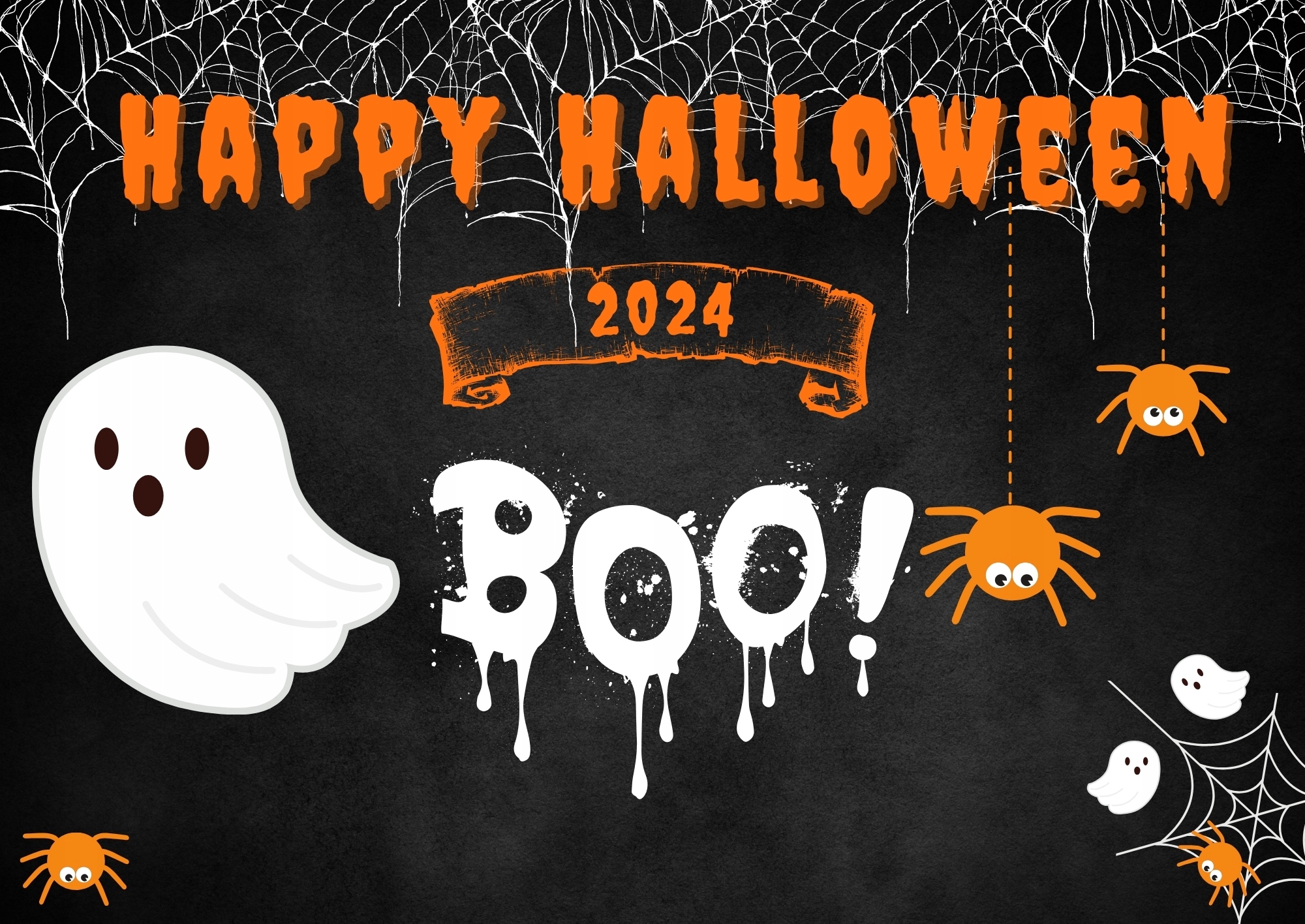 - Уникальный плакат на Хэллоуин со словами Happy Halloween 2024 и BOO !