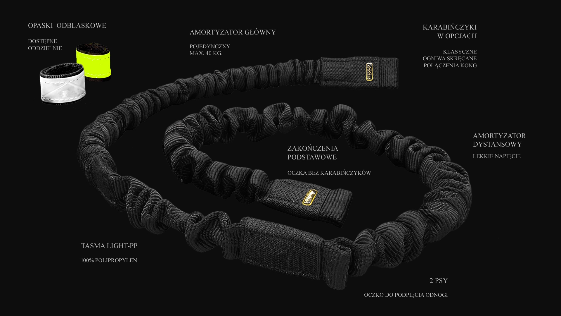 Структура веревки прогрессивная: основной амортизатор работает при сильном натяжении, а также поглощает рывки, а дистанционный амортизатор срабатывает в состоянии покоя, укорачивает веревку до длины мин. 1,4 м, а при легком натяжении увеличивает расстояние до фактической длины примерно 2,2 м.