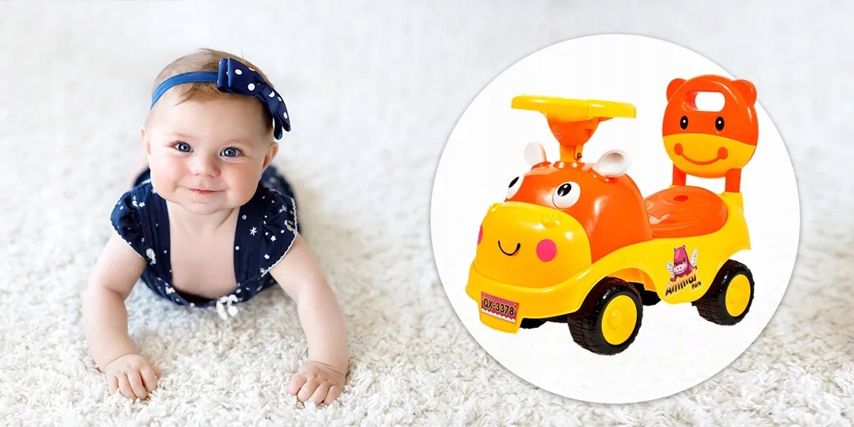 - Ребенок управляет транспортным средством, толкая его ногами< /li>