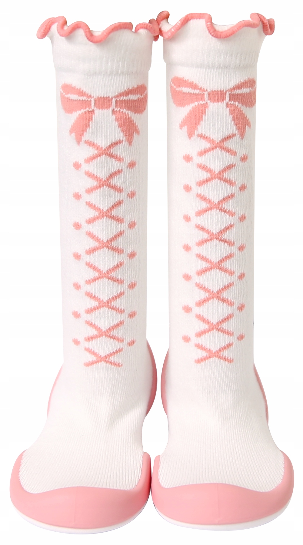 Настоящая новинка на рынке! Носки и туфли до колена в одном. Эта уникальная модель состоит из белых носков по колено с рюшами, украшенных узором из розовых шнурков, заканчивающихся бантиком. Все это дополняет бело-розовая подошва в той же цветовой гамме.