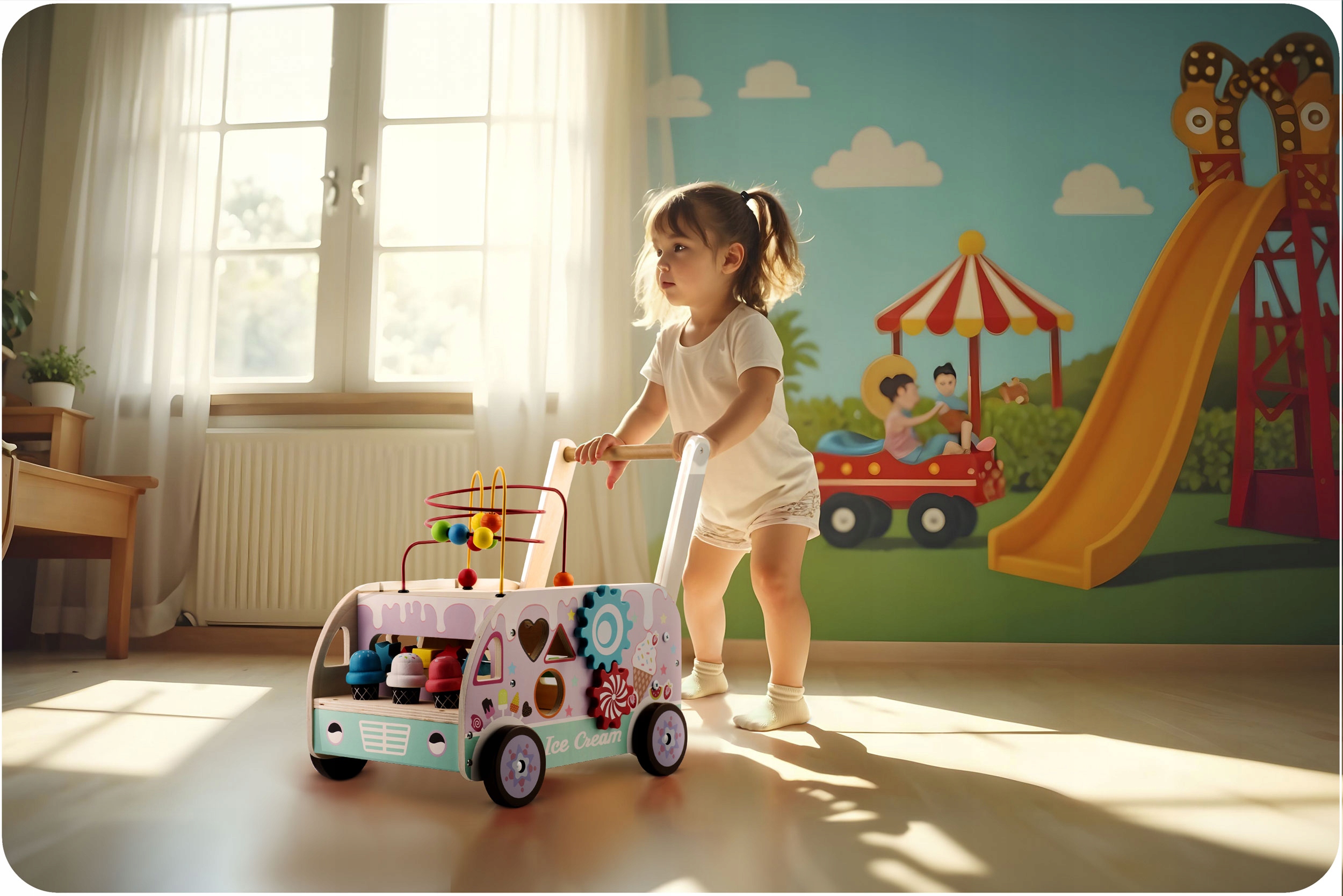 - позволяет ребенку направлять игрушку, способствуя активной игре и развитию навыков ходьбы.