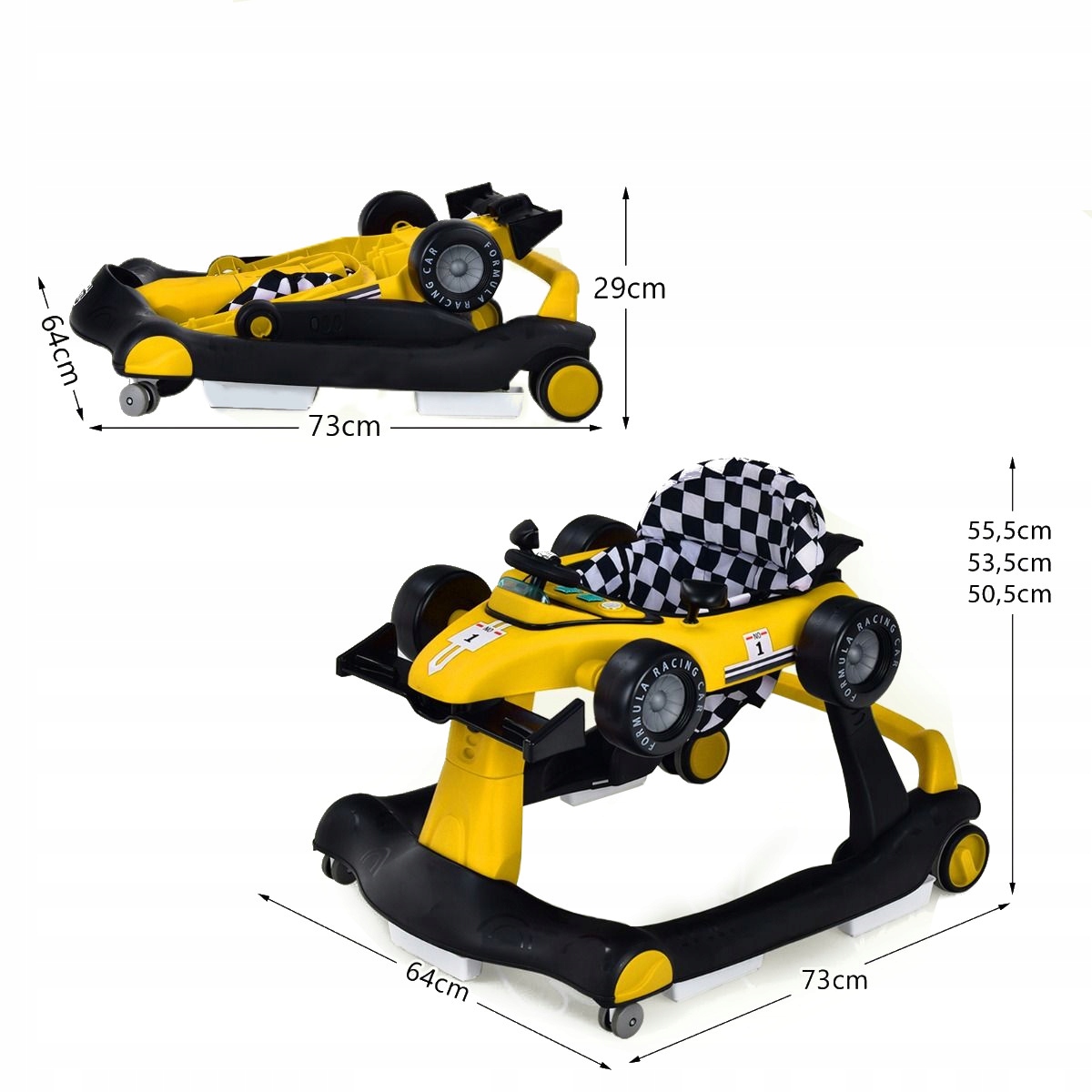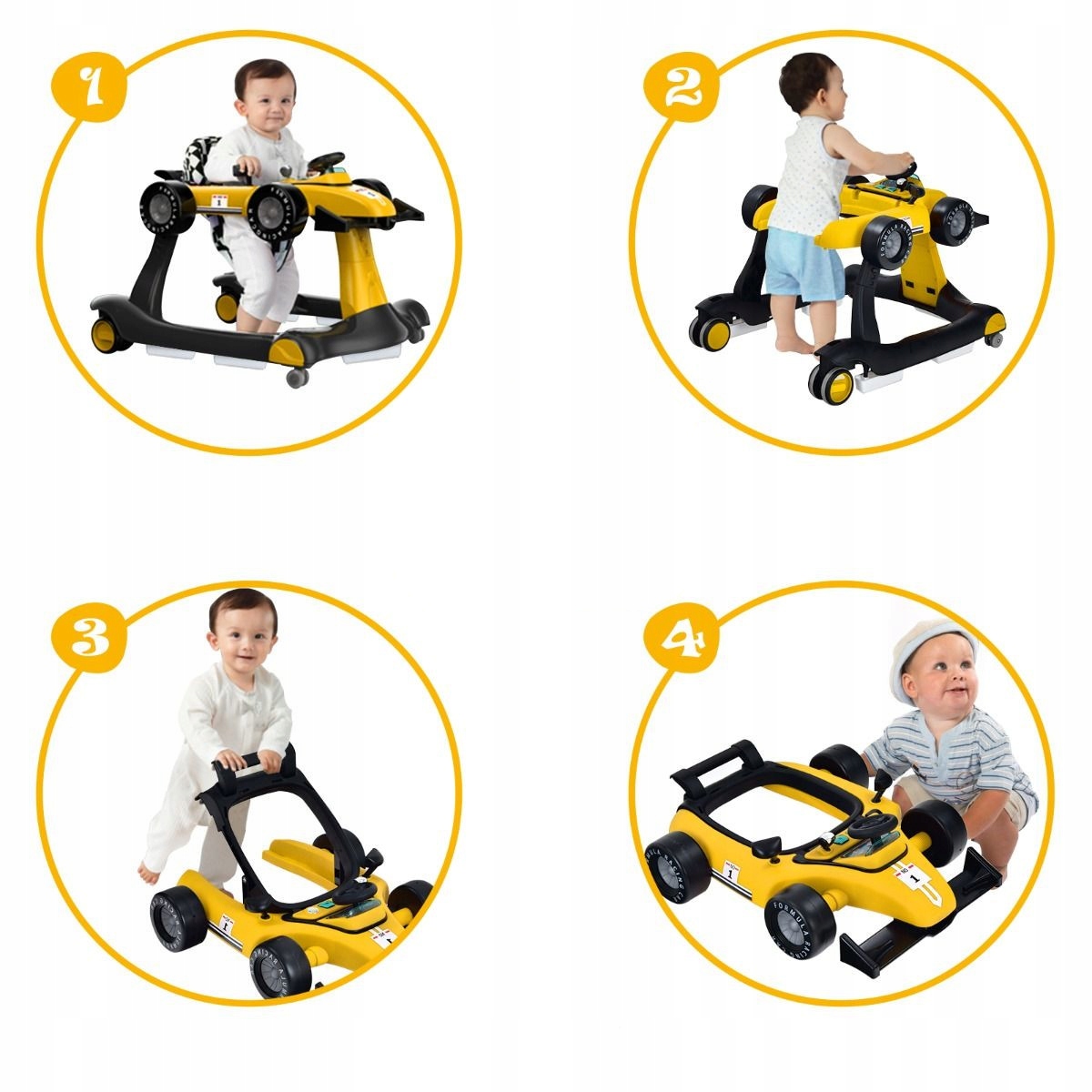 Многофункциональные ходунки 4-в-1 — идеальный компаньон для детей, которые учатся ходить! Он включает в себя четыре различных режима: режим первых шагов, режим толкания, режим толкателя и режим вращающегося автомобиля. Кроме того, его высота и скорость регулируются в соответствии с ростом и потребностями ребенка. Заботясь о безопасности малыша, мы оснастили его бампером, нескользящими подушечками и колесиками. Удобная подушка с мягкой губкой и эргономичная спинка обеспечивают комфорт во время сидения. Дополнительно игрушка оснащена музыкальной шкатулкой с подсветкой, привлекающей внимание детей. После использования его можно легко сложить и хранить, занимая мало места в доме.