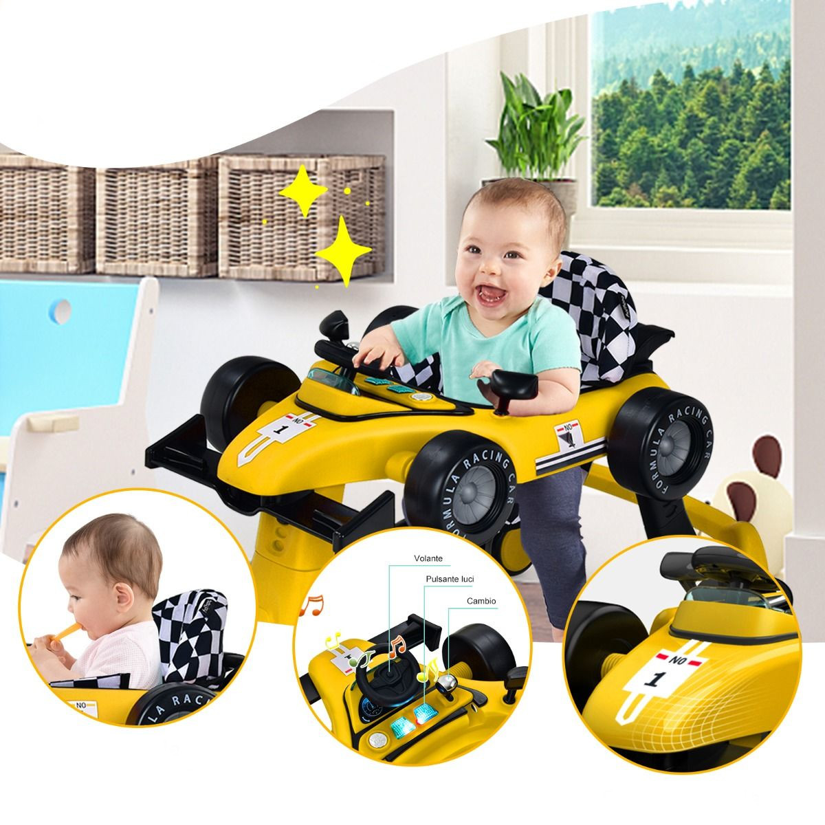 Многофункциональная развивающая игрушка: Ходунки имеют конструкцию 4-в-1, включая режимы «Первый шаг», «Толчок», «Толкай автомобиль» и «Поворот автомобиля». Благодаря этому он удовлетворяет потребности на различных этапах разработки.