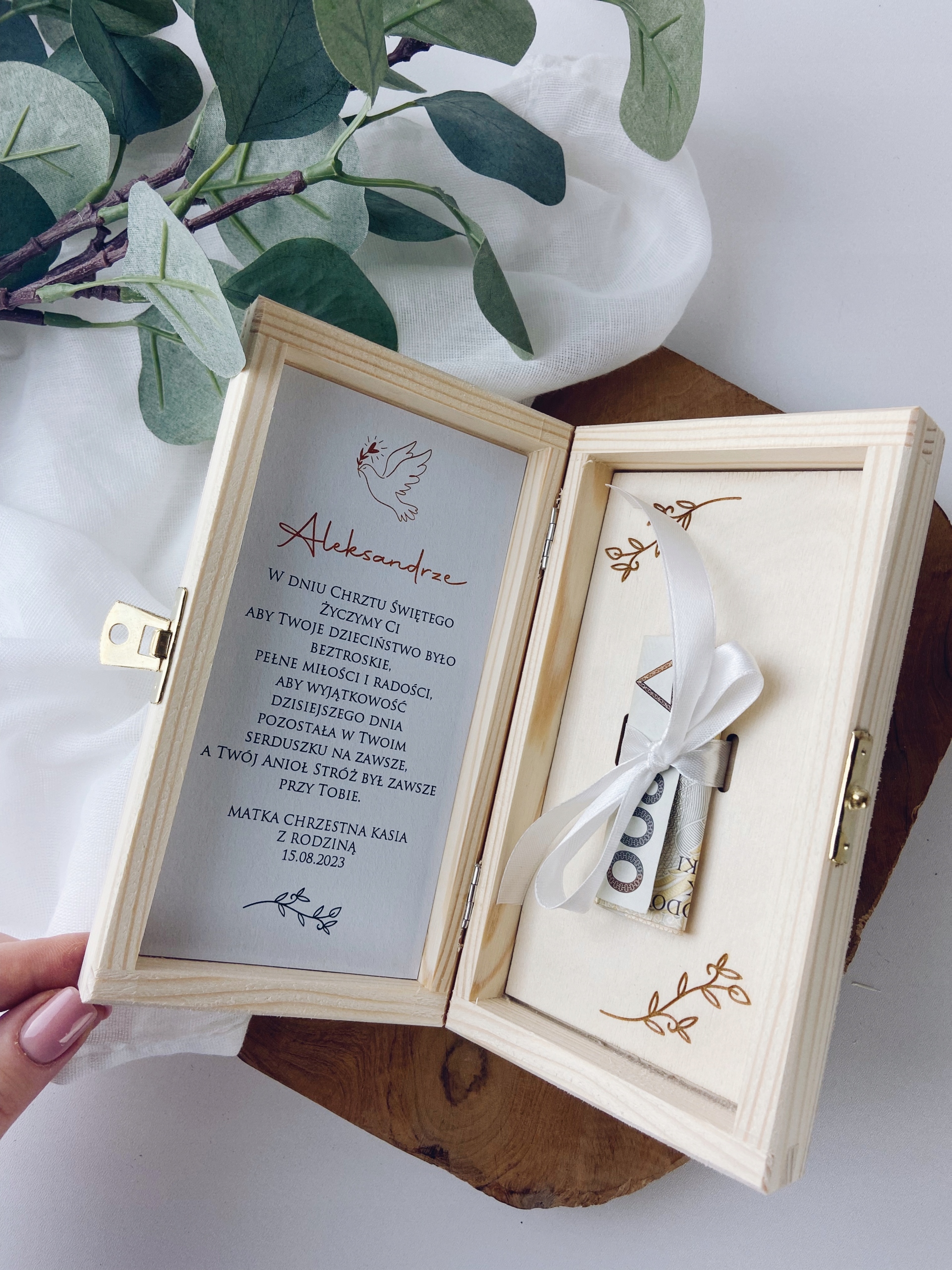 Изящная бело-золотая коробочка для денег или подарочной карты – идеальный способ преподнести подарок по случаю Святого Крещения в красивой, символичной форме.