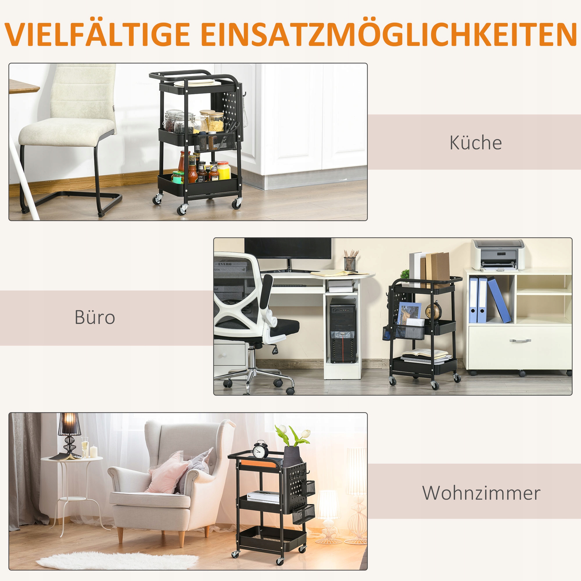 ● Трехуровневая полка обеспечивает достаточно места для материалов и аксессуаров; ● Корзины обеспечивают циркуляцию воздуха, идеально подходят для хранения овощей, фруктов и сложенного белья; ● Доска «Сделай сам» с 4 съемными крючками и контейнерами для хранения двух размеров предлагает креативные решения; ● 4 легко скользящих колеса обеспечивают мобильность, два из которых блокируются; ● Стальная рама и пластиковые колеса обеспечивают устойчивость и долговечность; ● Подходит для кухни, офиса, спальни, гостиной, прачечной, гаража и ванной комнаты; ● Требуется сборка;