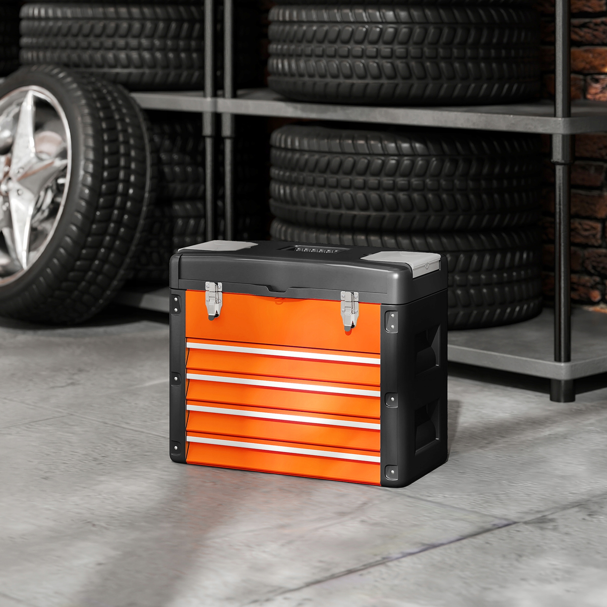 ● Цвет: Оранжевый+Черный; ● Материал: Сталь, Пластик; ● Габаритные размеры: 49,7Д x 25,3Ш x 40,7В см; ● Размер ящика: 39Ш x 21,5Г x 5В см; ● Размер верхнего места для хранения вещей: 46S x 22D x 9H см; ● Размер коробки мини-деталей: 14D x 11,5S x 3В см; ● Грузоподъемность: 30 кг (общая), 10 кг (на каждый ящик);