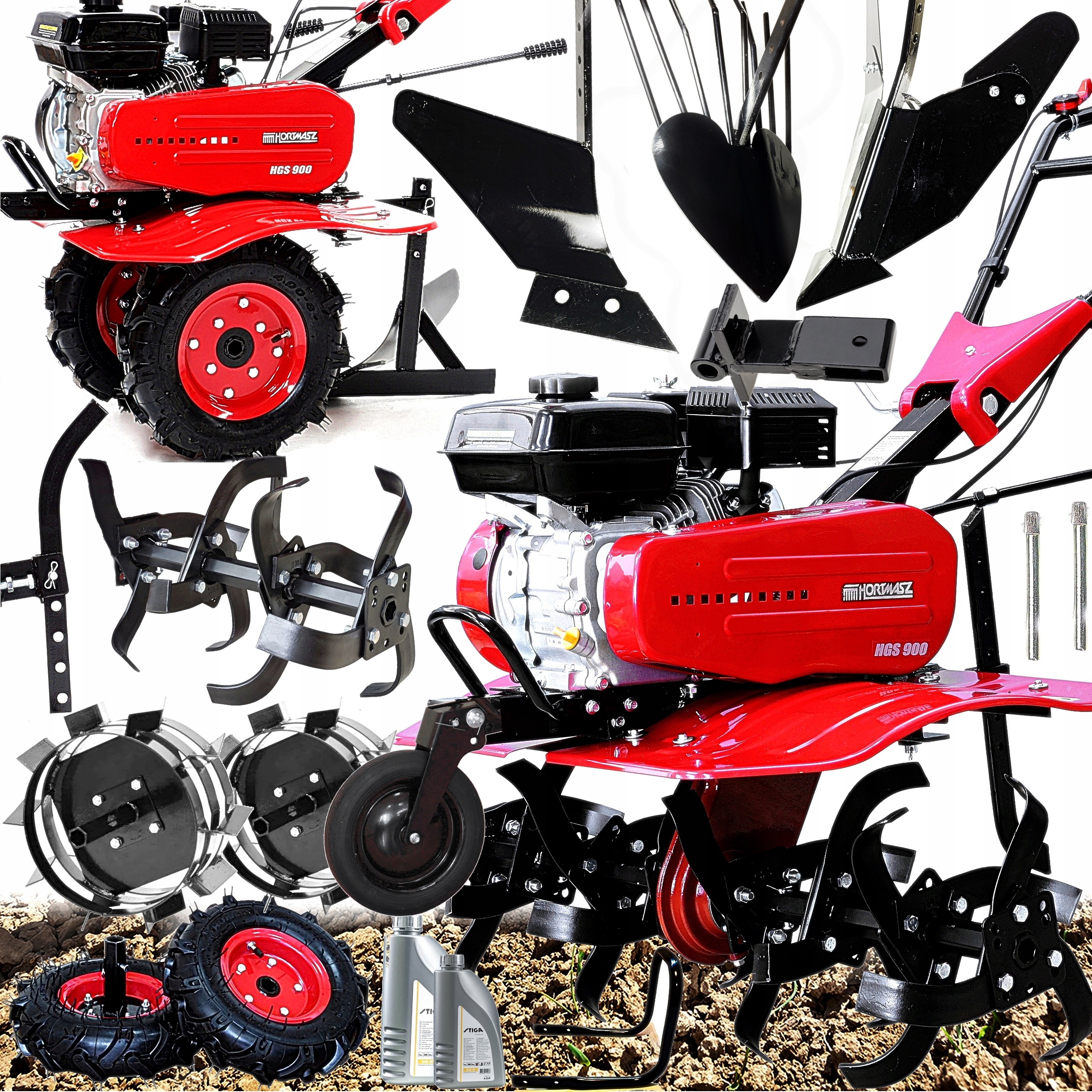 Бензиновый ротаватор HGS 900 – это очень большая и мощная машина, предназначенная для интенсивной работы в самых тяжелых условиях. Верхнеклапанный двигатель объемом 212 куб.см гарантирует достаточный запас мощности при работе с максимальной шириной захвата машины. Коробка передач с двумя передними и одной задней передачей гарантирует комфортную работу мотоблока и микротрактора, который легко трансформируется в машину для перемещения или работы с плугом, окучником или овощеуборочной машиной.