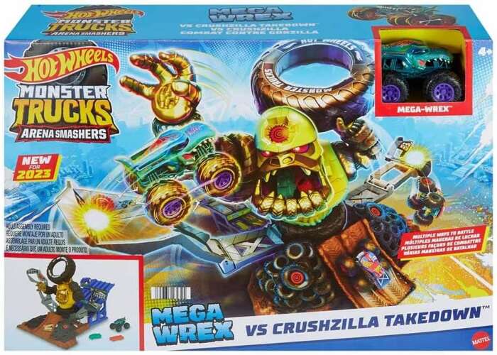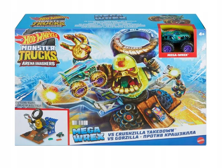 В набор входит один автомобиль Hot Wheels Monster Trucks Mega-Wrex в масштабе 1:64 и две машины. Набор предназначен для детей старше 4 лет.