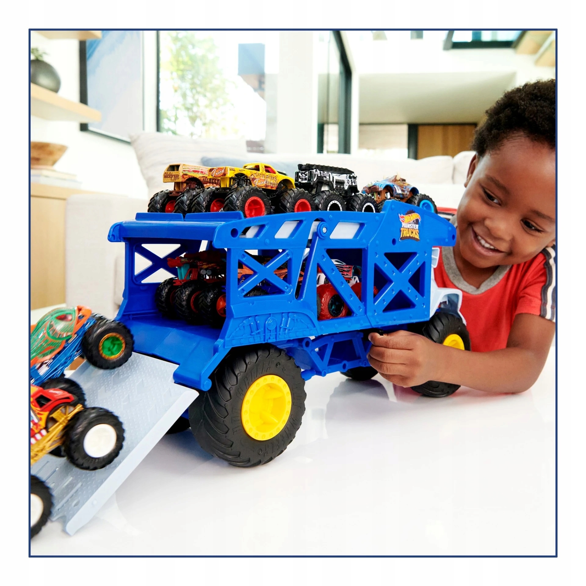 Он может вместить 12 монстр-траков в масштабе 1:64 или 32 автомобиля Hot Wheels® в масштабе 1:64, а также имеет опускающаяся рампа сзади, куда можно запускать игрушечные машинки (каждая продается отдельно).