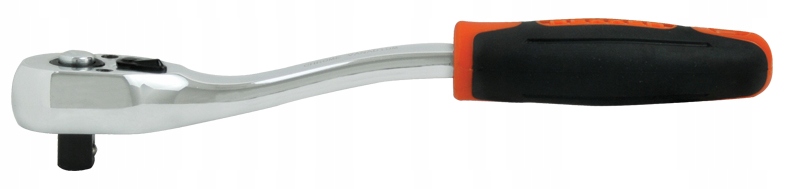 Изогнутая трещотка.Изделие изготовлено из хромованадиевой стали.Привод имеет защиту от выпадения из гнезд, рукоятка из двух материалов хорошо помещается в рука.