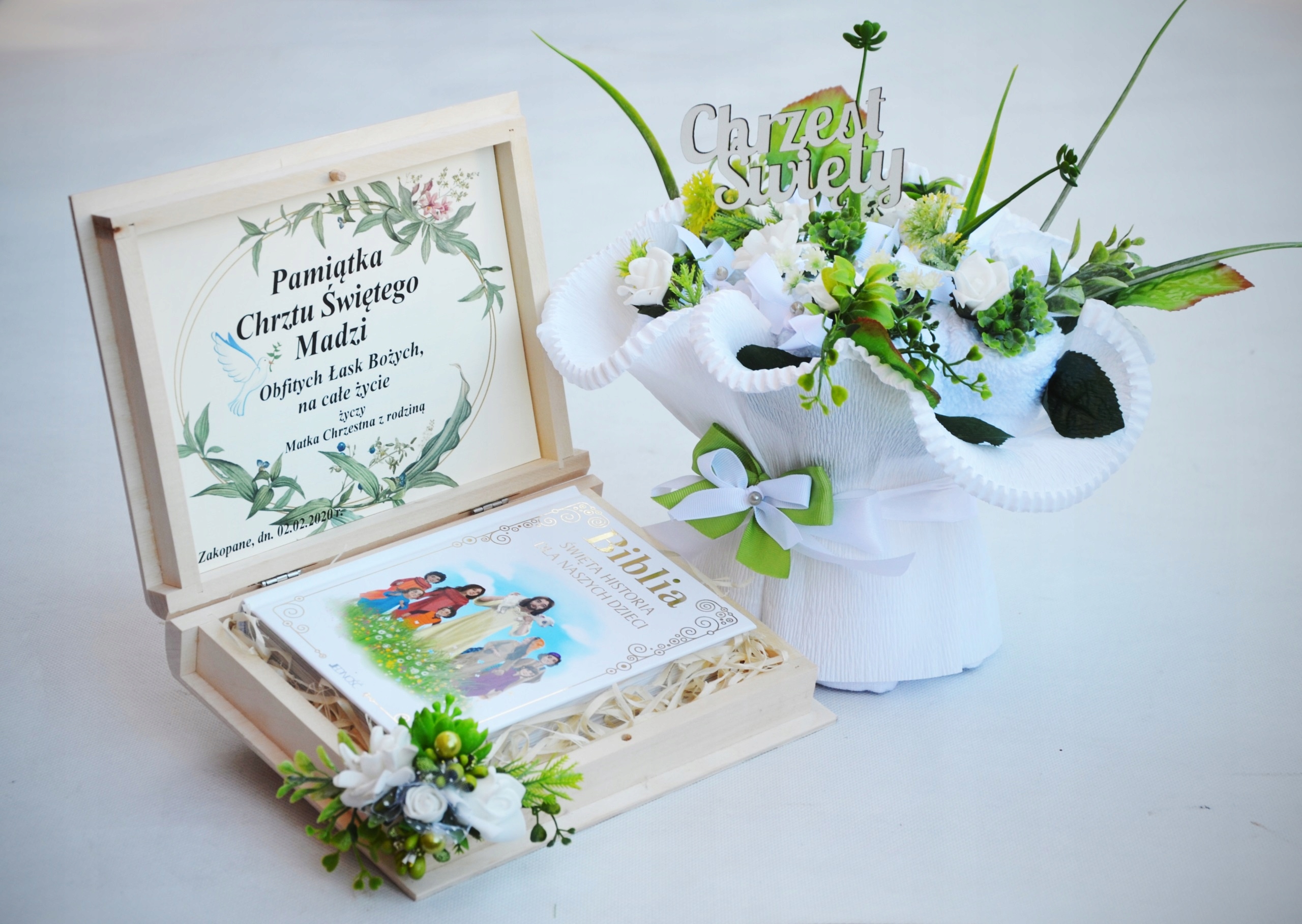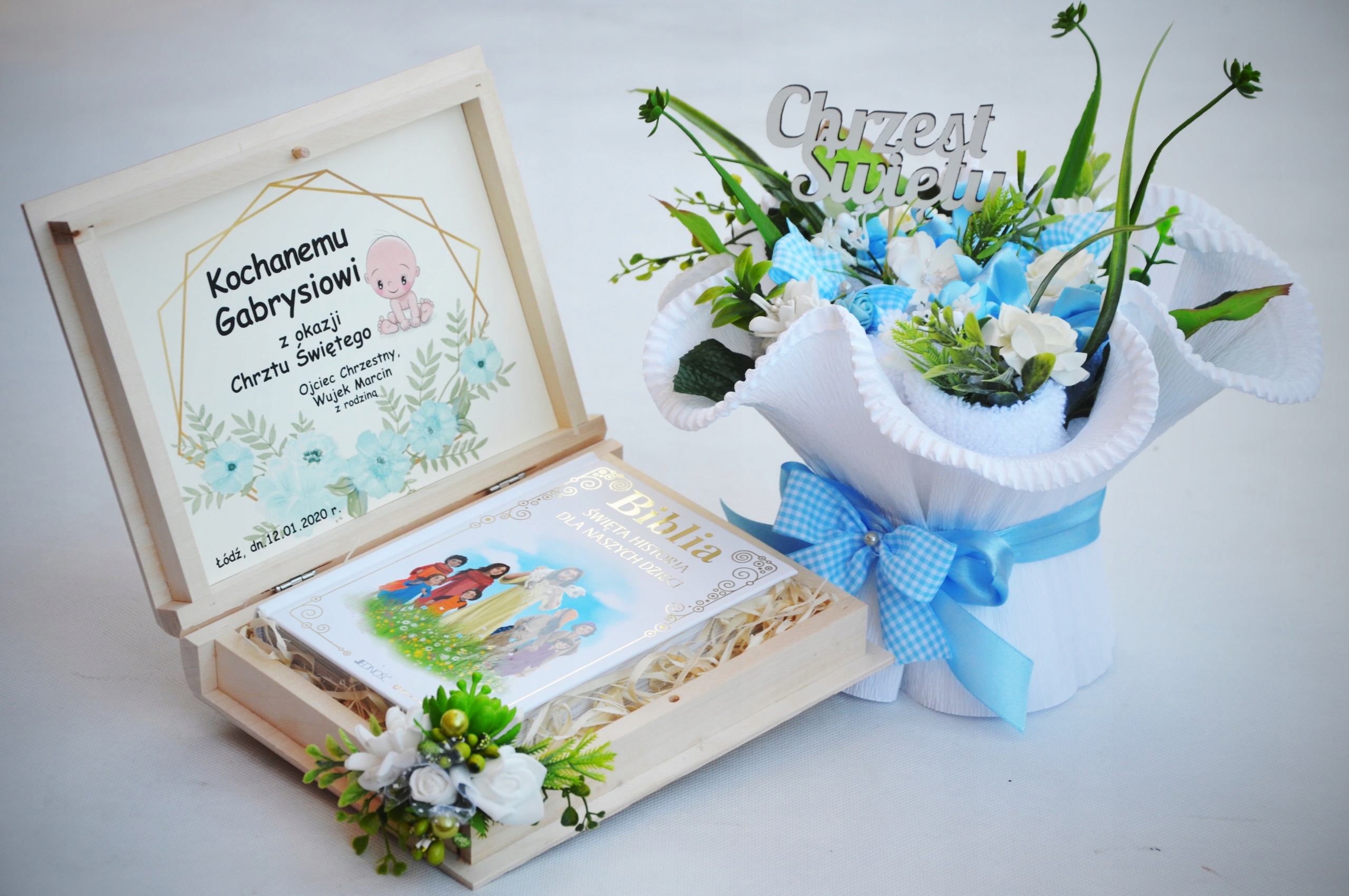 Уникальный и красивый набор: иллюстрированная Библия в деревянной коробке с персонализацией и букетом полотенец - идеальный подарок для святого крещения - практичный и оригинальный