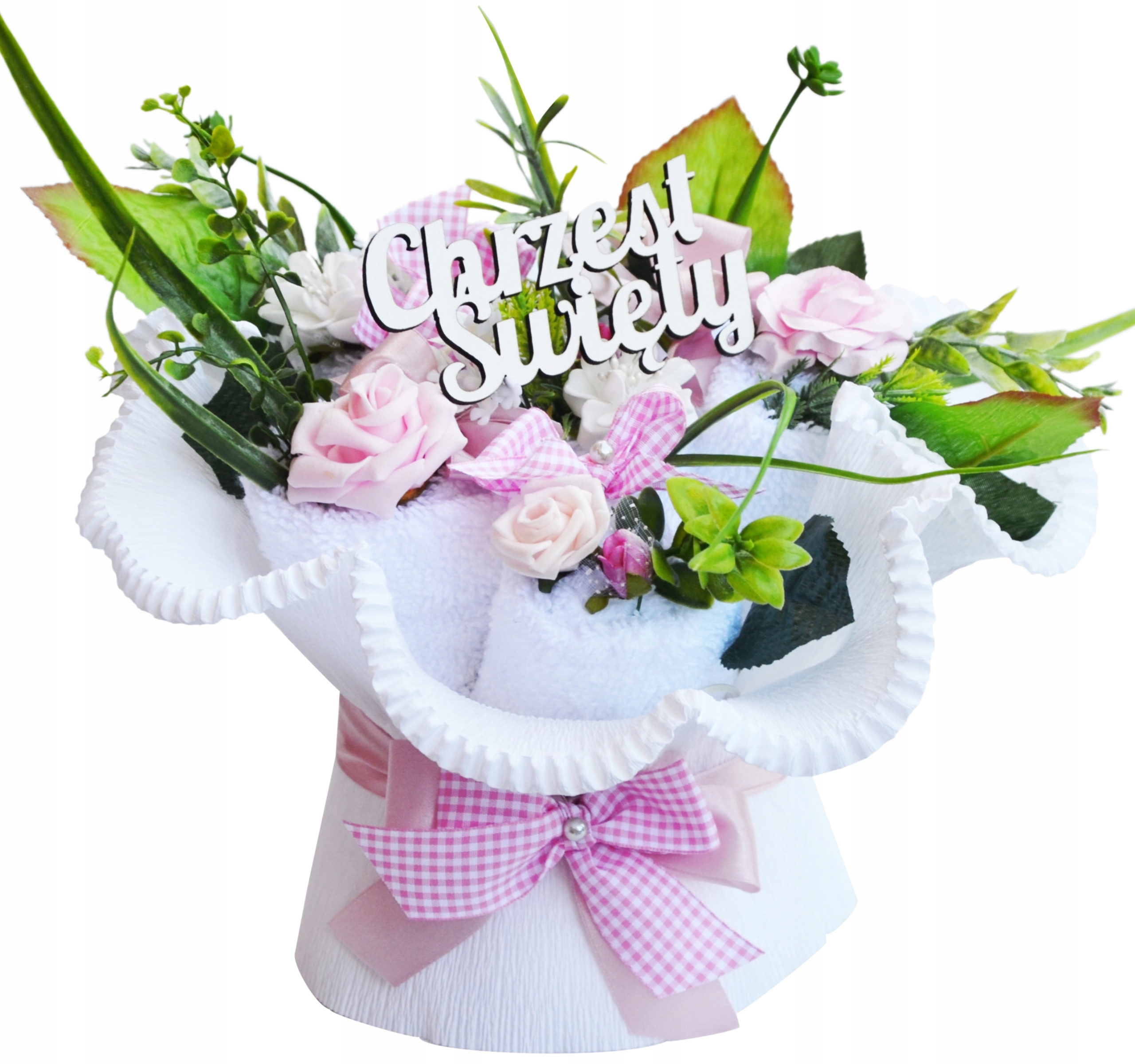Букет состоит из 3 полотенец для рук , размера 30x50 см. Полотенца очень приятны для Touch , мягкий , абсорбент и fat 500 г/м2 - идеально подходит для ребенка , после развития букета, идеально подходящего для ухода за ребенком Уникальный букет, который выглядит живым. Это порадует глаз дольше, чем нарезанные цветы. Целое сделано очень тщательно квалифицированными флористами. Деревянная надпись «святое крещение» добавляется в каждый букет. Вода , они мягкие и приятные для Touch , Plock Producer - соответствует ожиданиям наиболее требовательных пользователей.