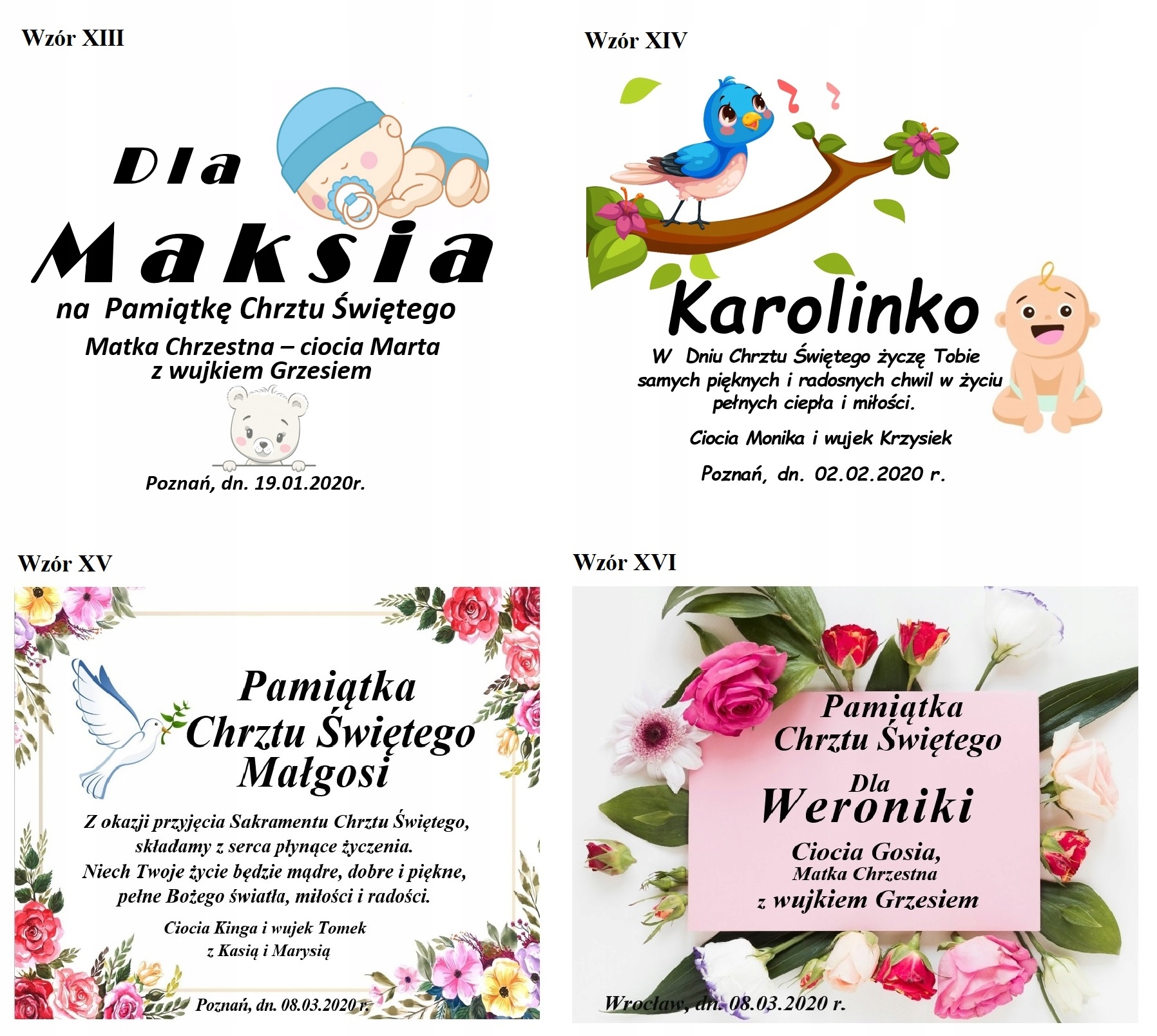 Ниже мы представляем шаблоны посвящения - мы изменяем данные на имя ребенка, подпись, место и даты. коробки.